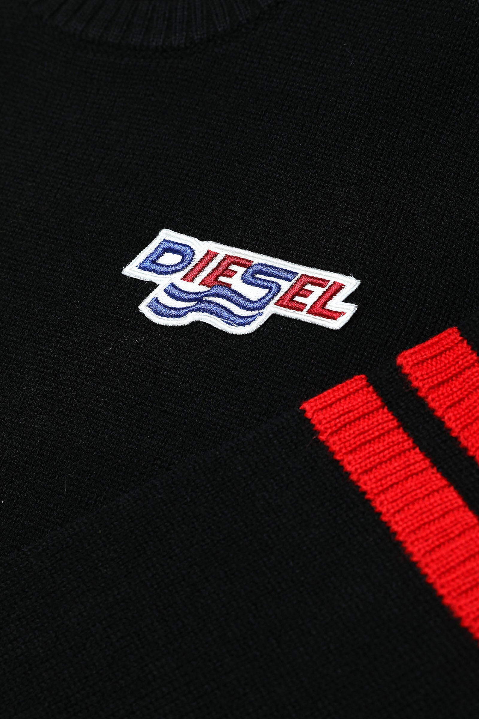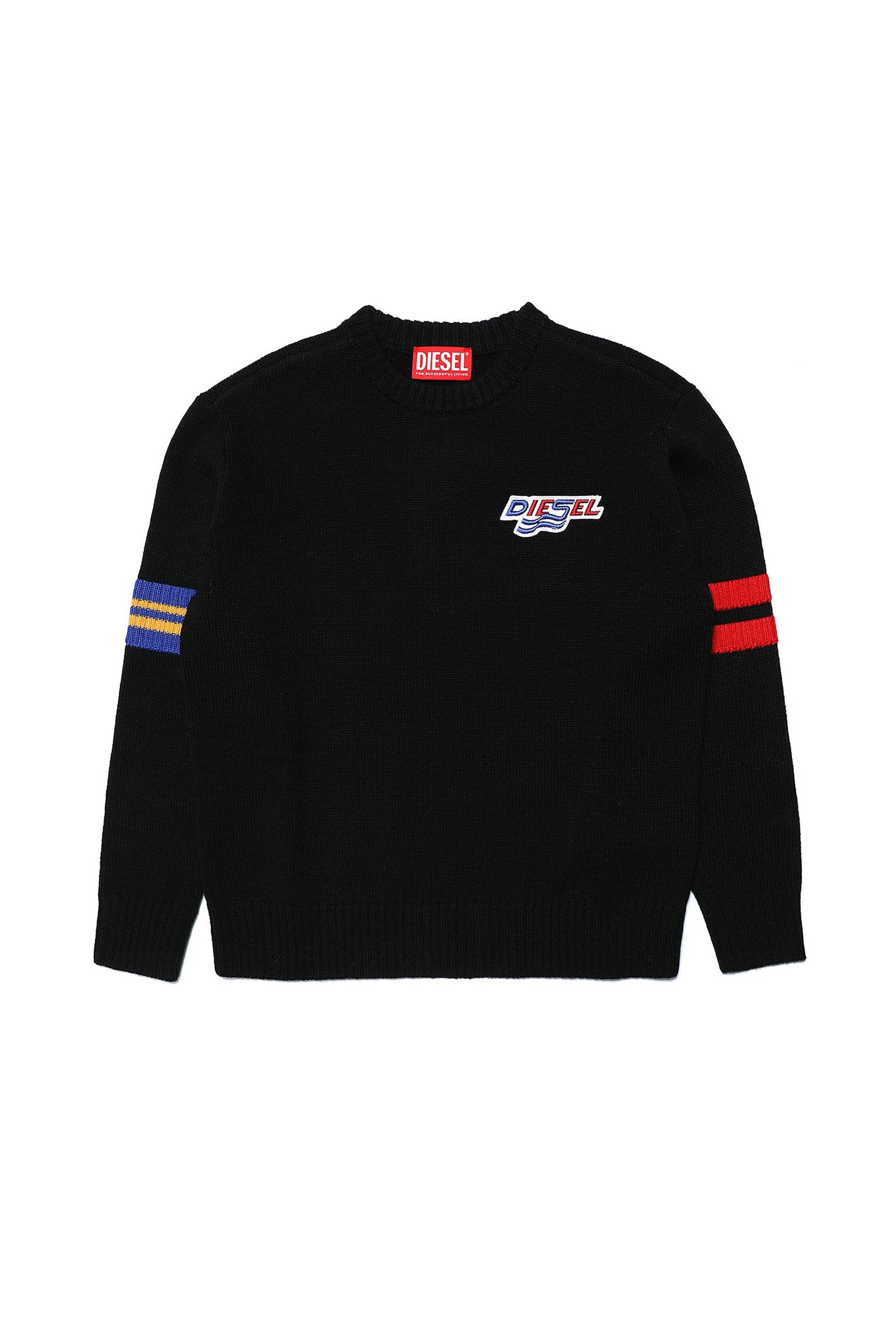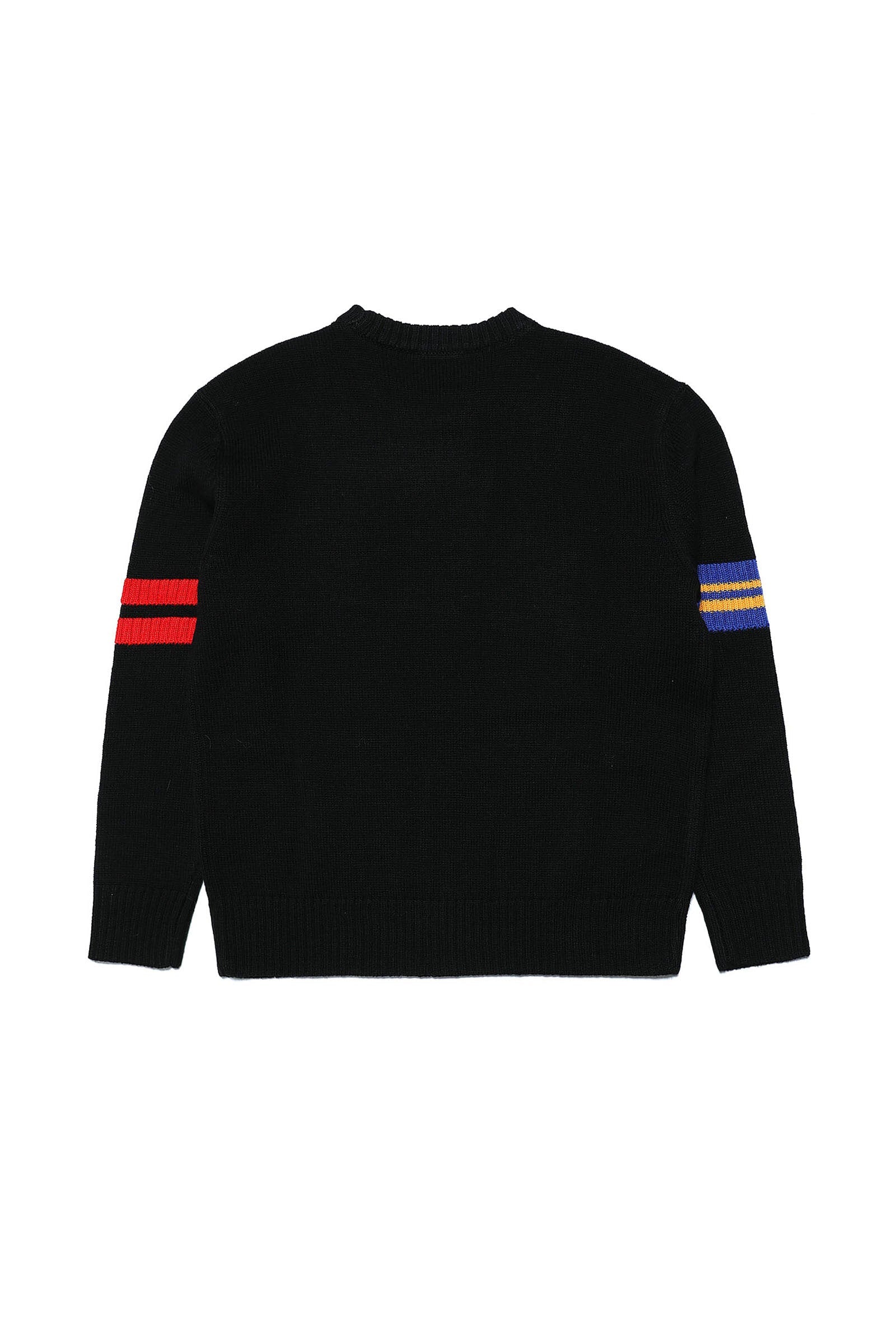 Black sweater with logo patch and colored bands
