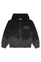 Long-sleeved hooded sweatshirt, black, with contrasting gradient detail from the bottom and central lettering detail.