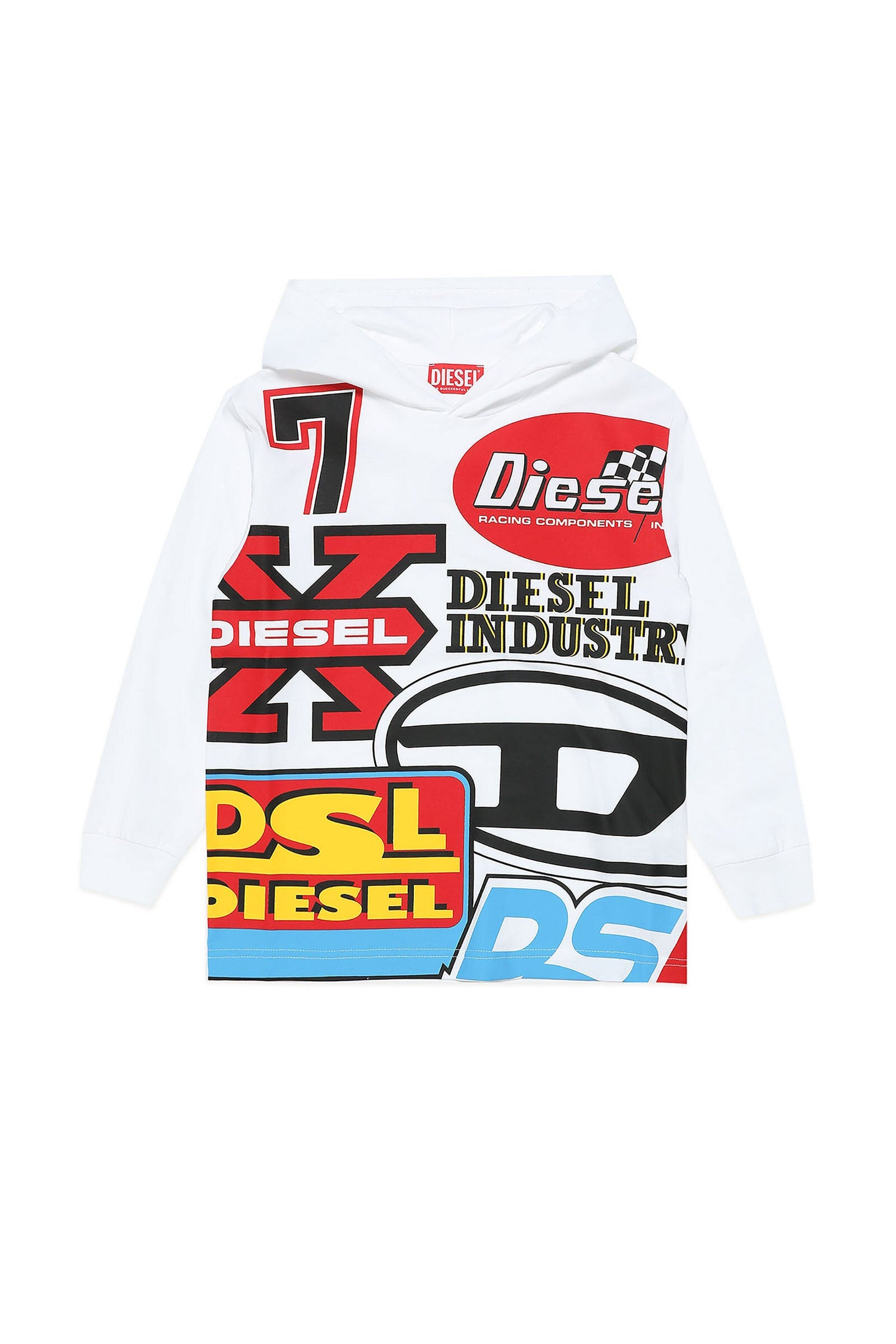 White t-shirt with racing-inspired hood