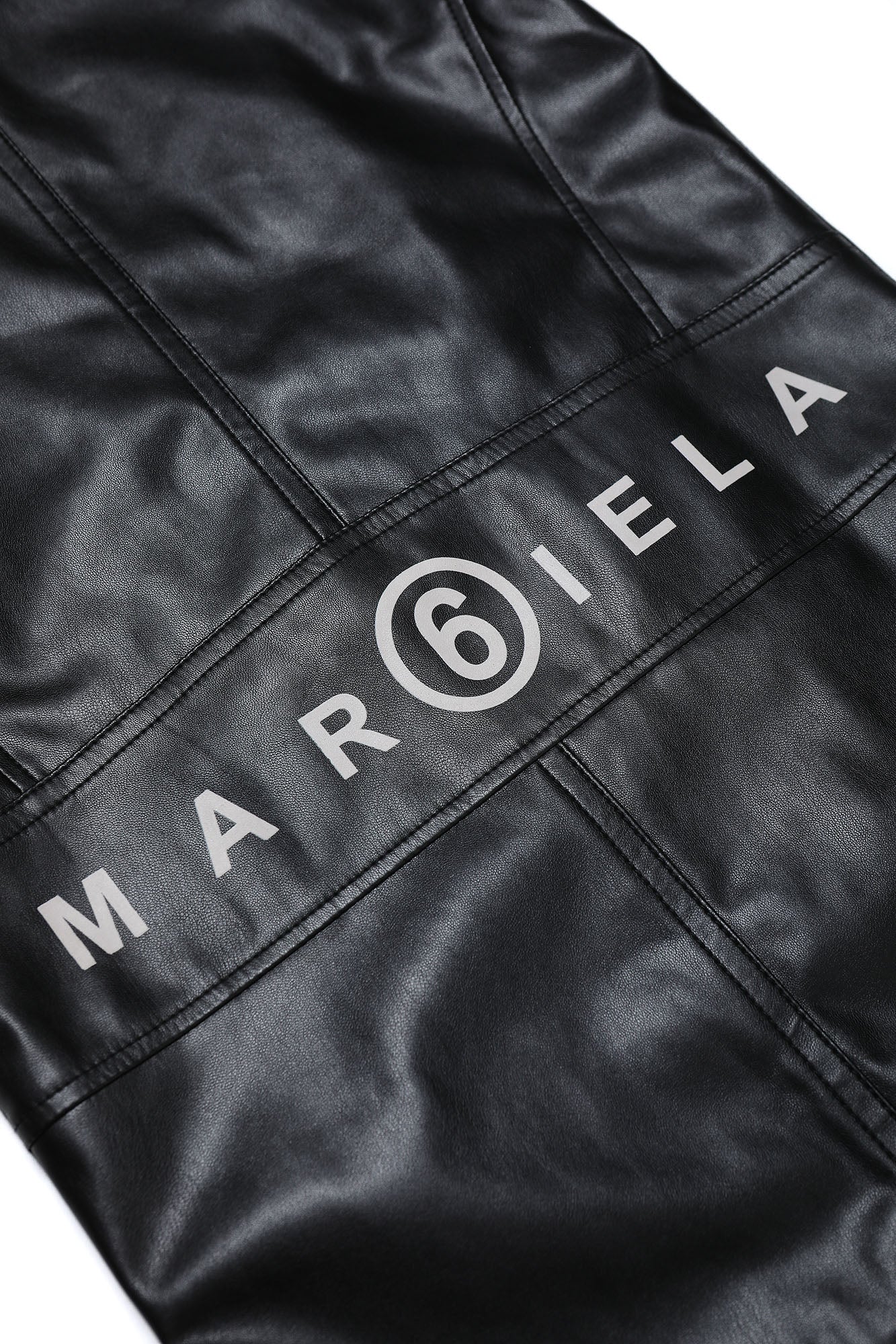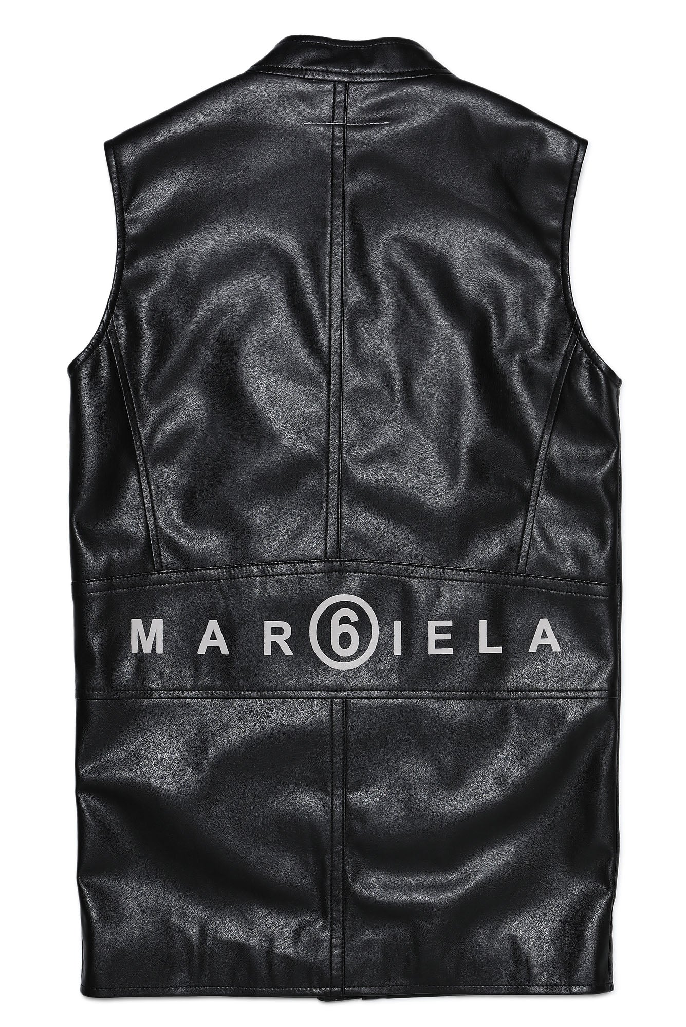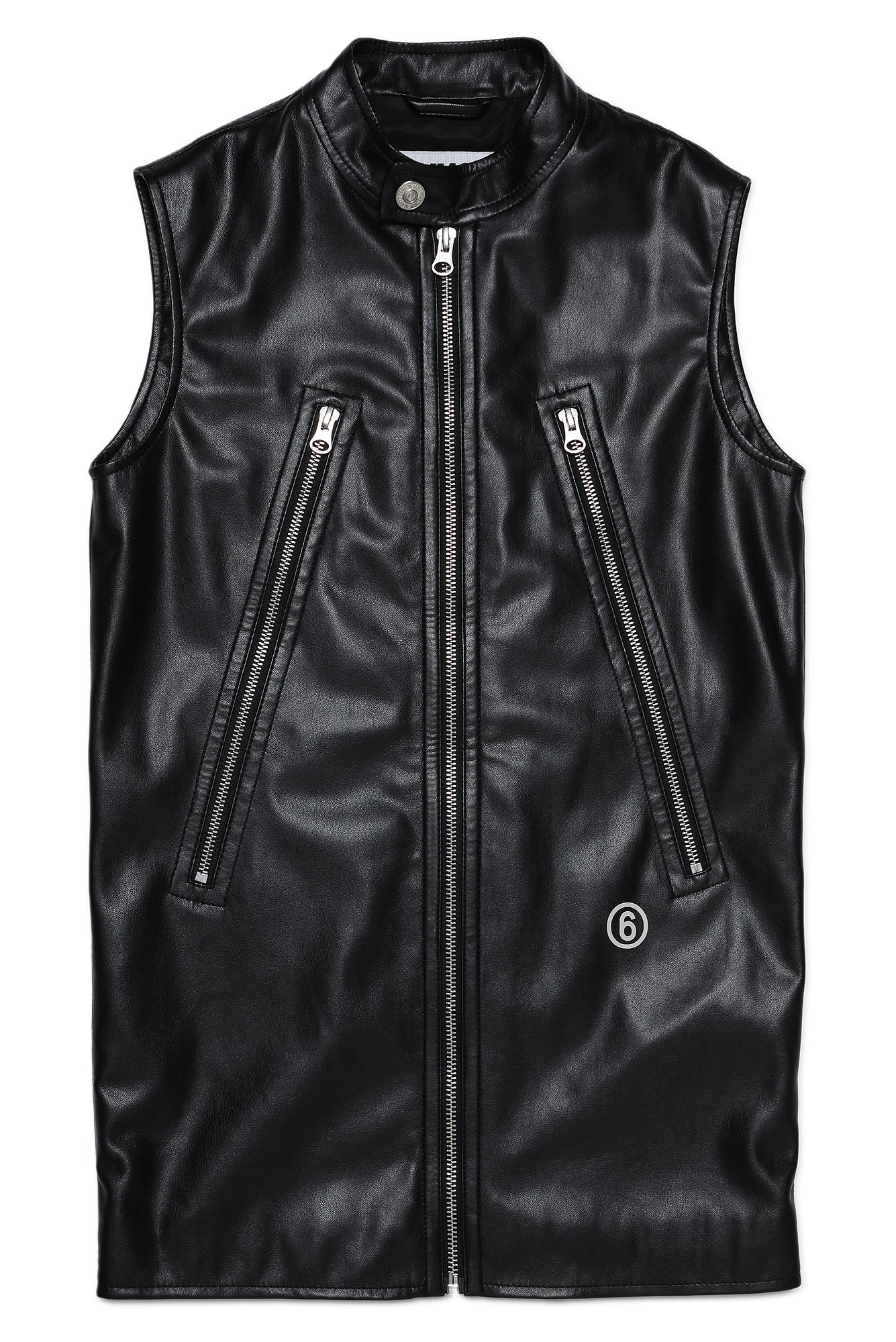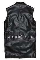 Synthetic leather vest, sleeveless, with central zip button closure at the top and with maxi front pockets with zip closure. Margiela lettering detail printed in white on the back.