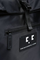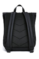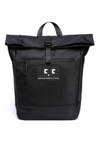 Black backpack, with large main compartment with folded closure, equipped with front pocket with zippered logo for storing smaller items. Padded shoulder straps and handle 29 cm (L) x 48 cm (H) x 10 cm (W).