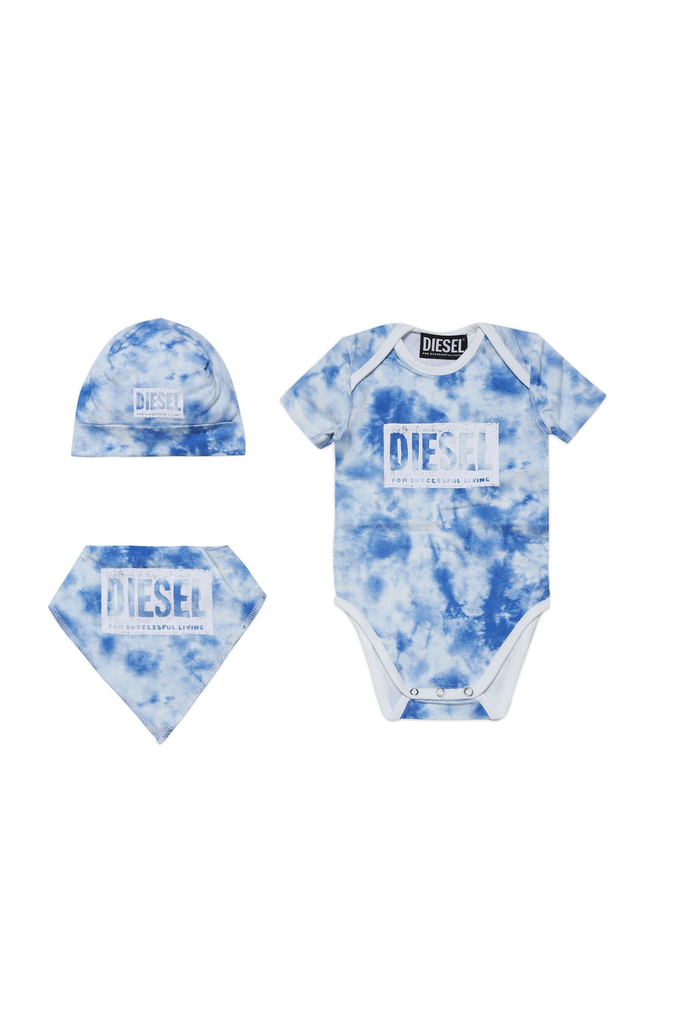 Newborn bodysuit, short-sleeved, with front Diesel logo. All-over cloud print.