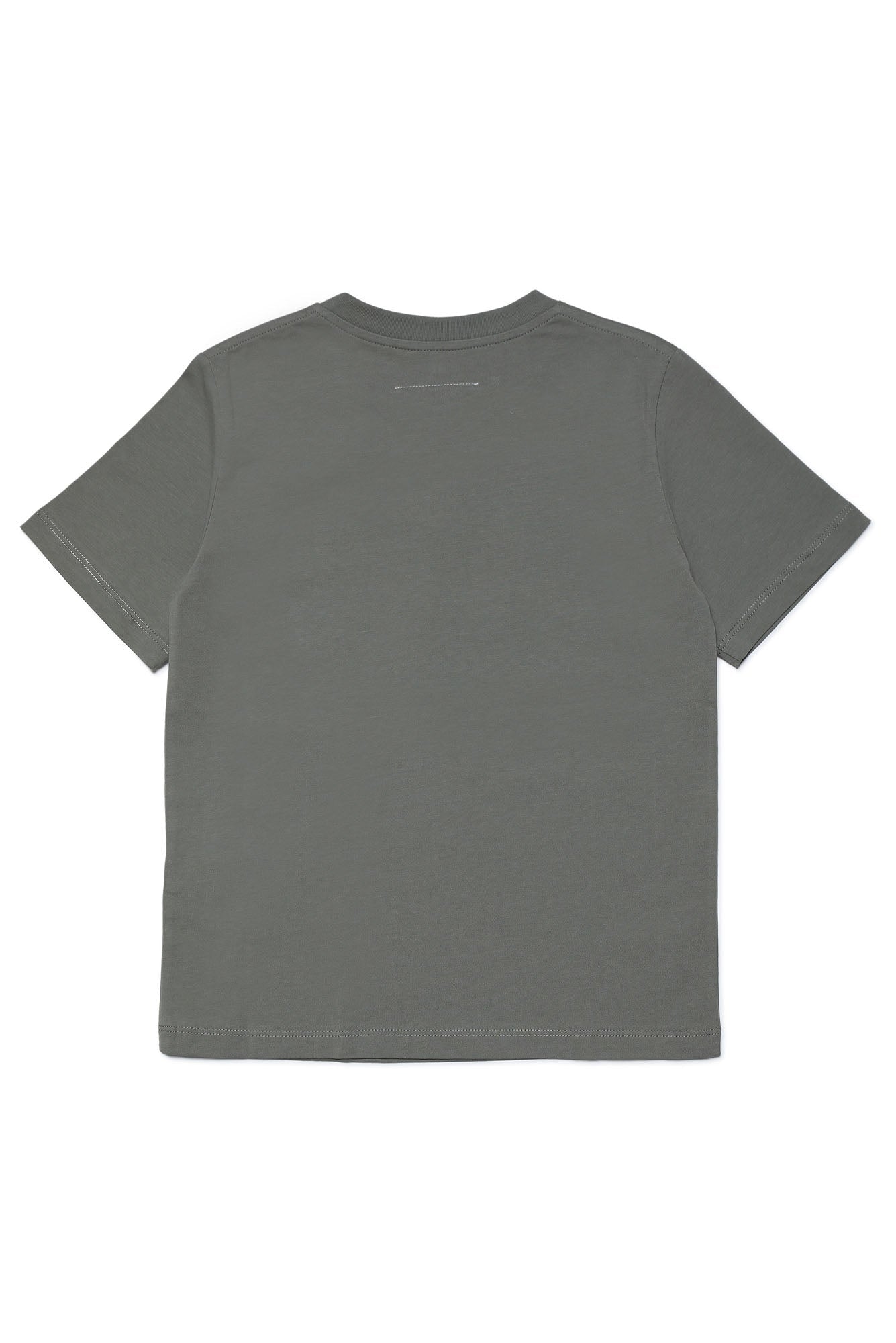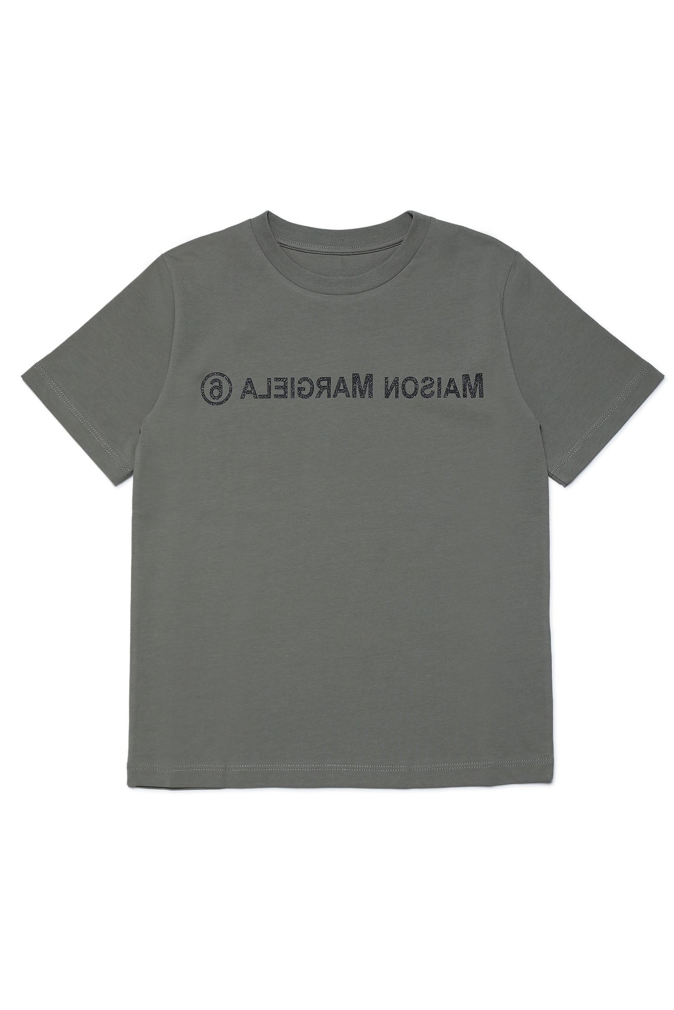 Mastic gray crew-neck T-shirt, short-sleeved, with contrasting Maison Margiela 6 central lettering detail. Made of 100% cotton.