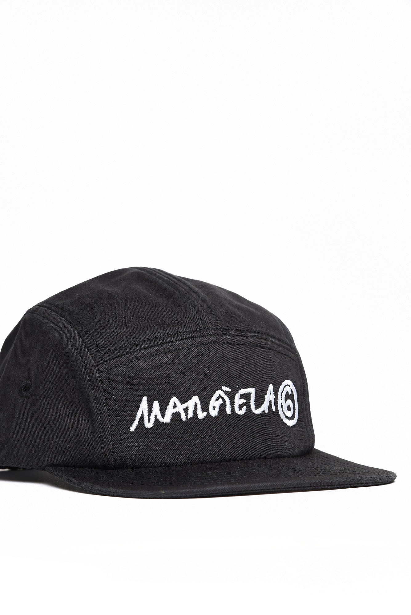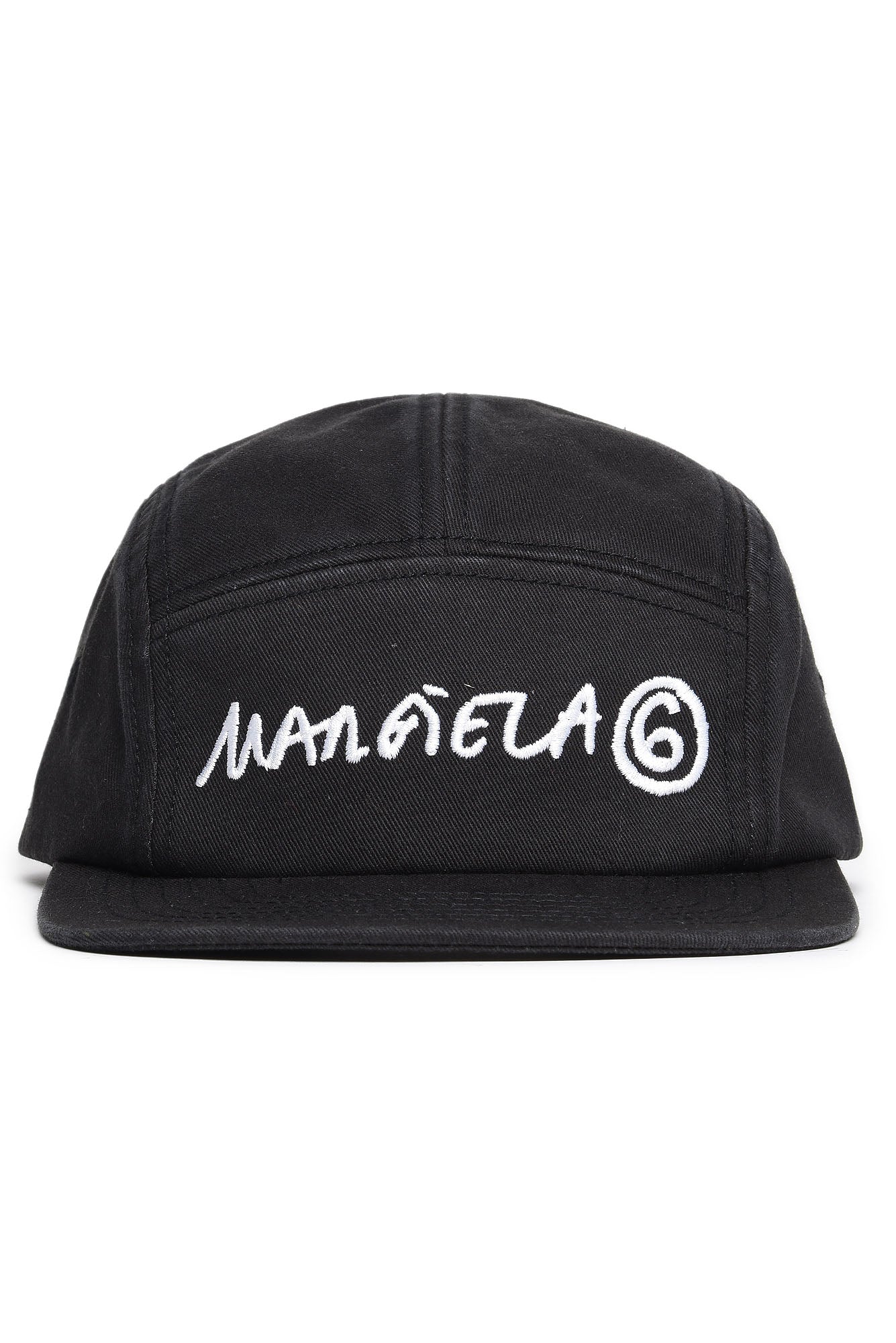 Baseball cap with visor, black, with contrasting white Margiela 6 logo. Adjustable size with special back strap. Size I: width. 54 length. 31 size II: width. 56 length. 32.5 size III: width. 58 length. 34