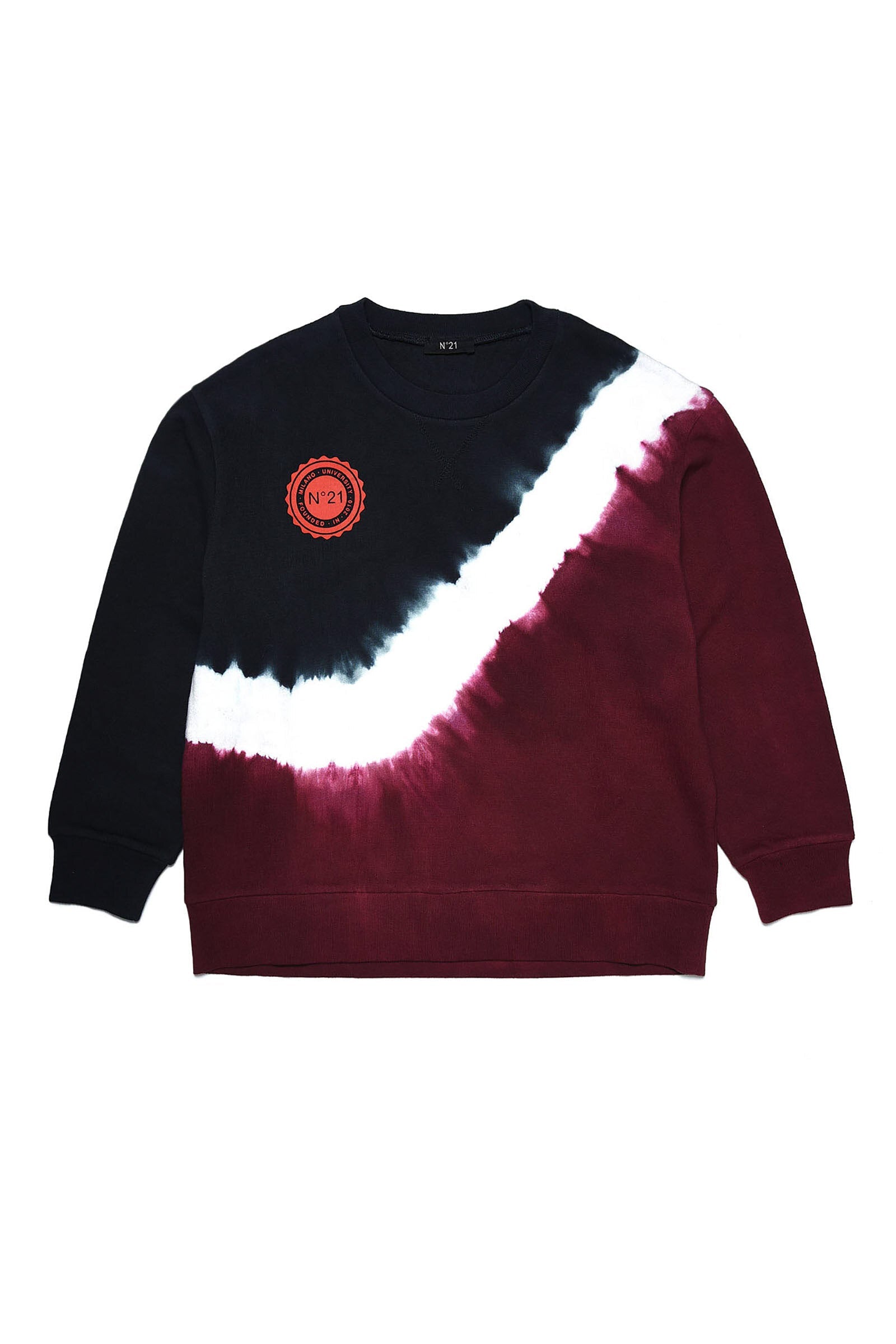 Long-sleeve, crew-neck burgundy red cotton sweatshirt with tie-dye effect and circular logo print.