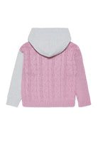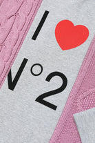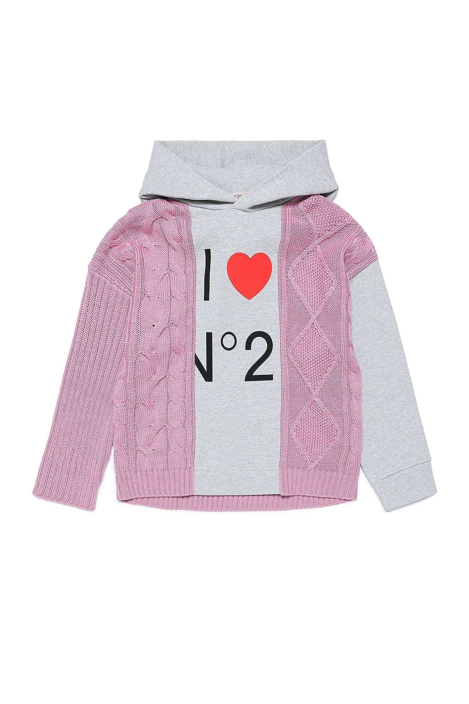 Hooded fabric mix long-sleeve sweater, pink braided knitwear with melange gray fleece inserts and front I love N°21 print.