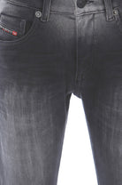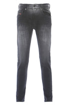 Black denim pants, with regular waist, slim leg, characterized by micro-tears and torn parts with denim inserts applied inside.