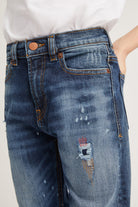 5-pocket jeans, carrot fit model, with regular waist and low crotch. Blue stretch denim with colored tears and mending.