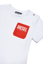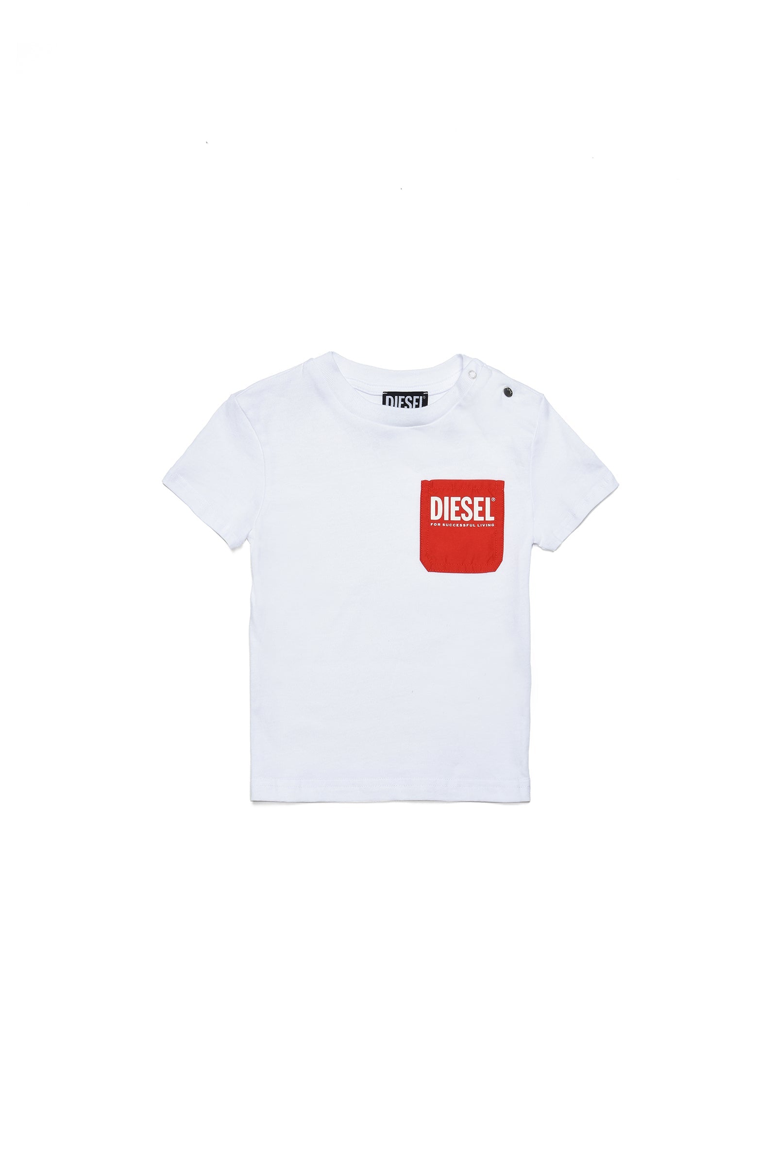 Crew-neck T-shirt with side buttons, short-sleeved, with contrasting pocket. Made of 100% cotton.