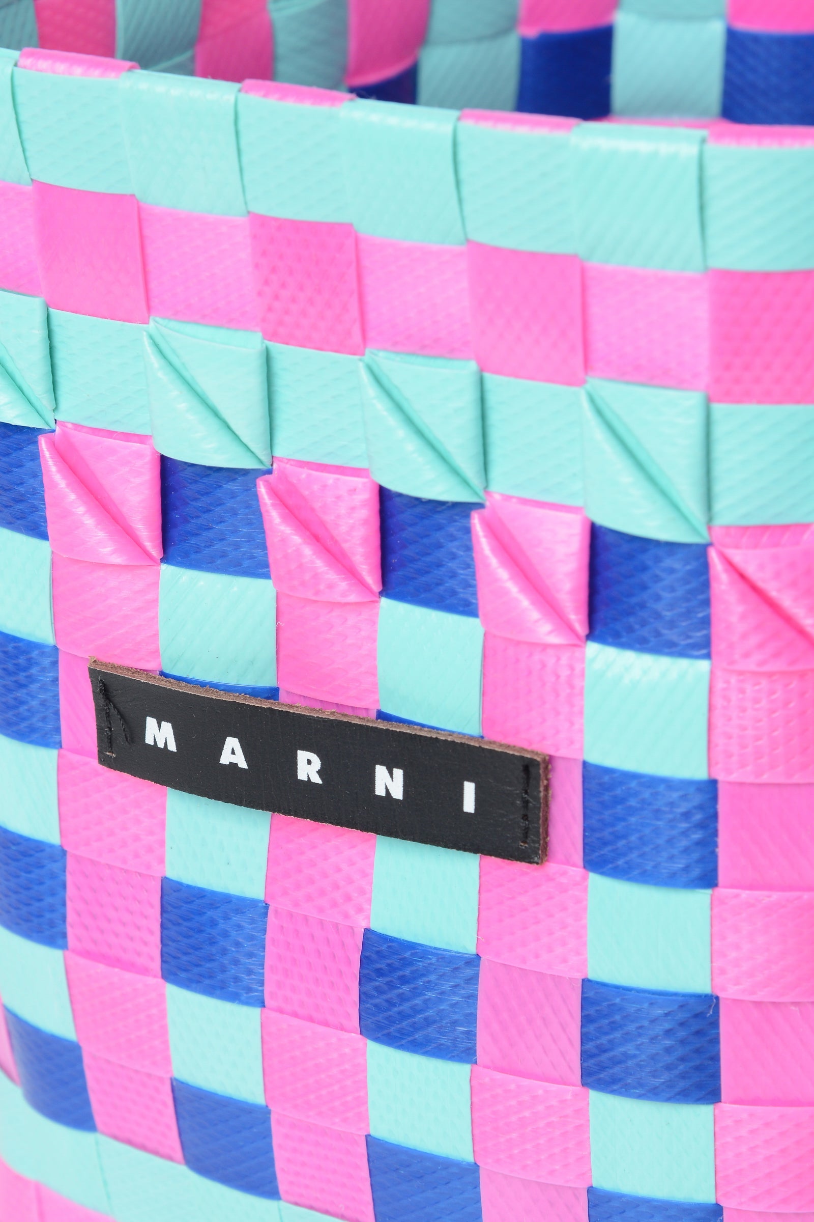 Mini shopper bag, basket bag model, woven with a mosaic effect color game and Marni logo on a black Base. Width 12 cm Height 16 cm Depth 12 cm Handle 10 cm.