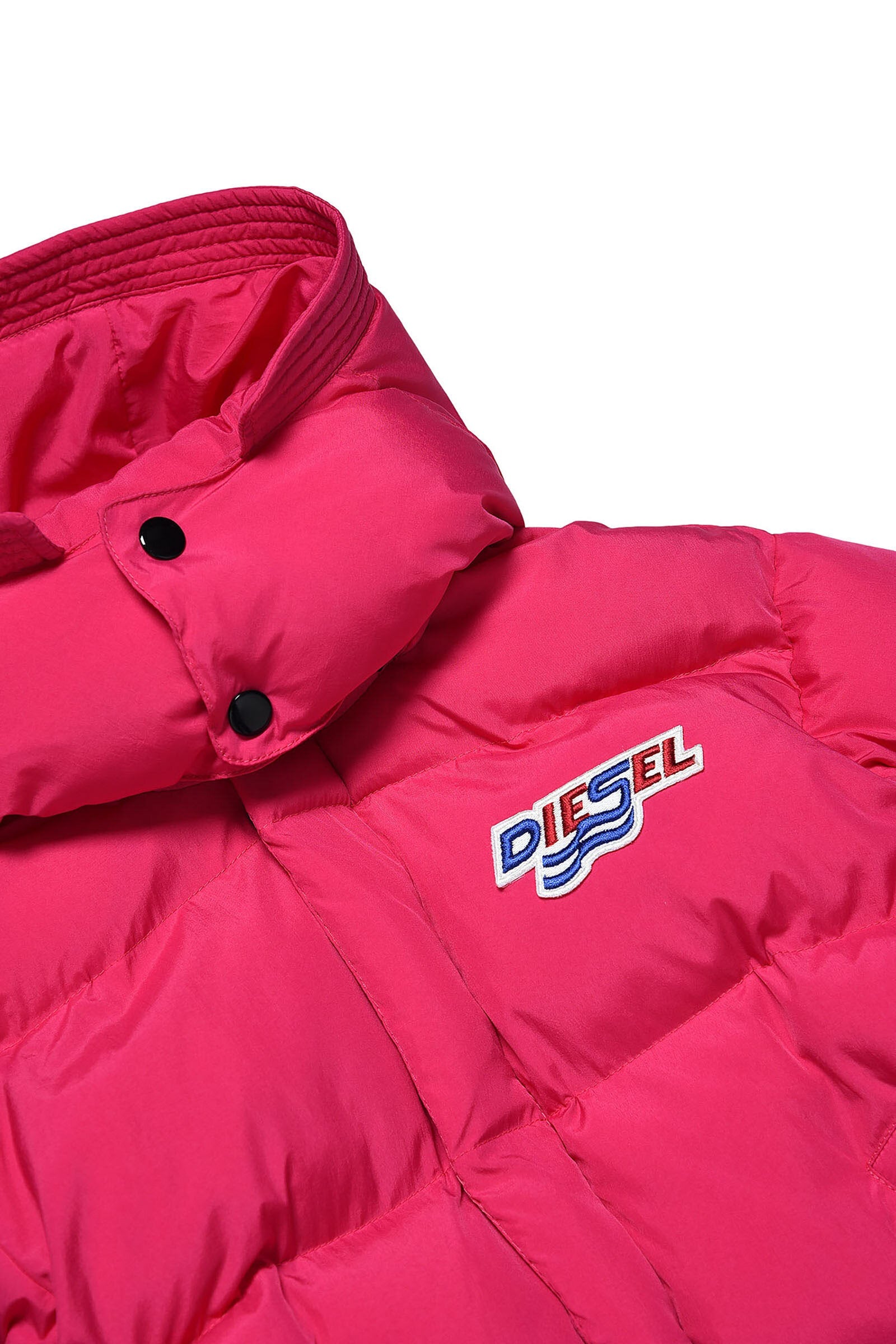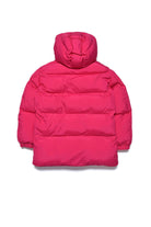 Long pink quilted jacket in fake down, with high neck, two-button closure, detachable hood, double zip and hidden press-stud closure, side pockets, long-sleeve with elastic cuff and colored logo patch print detail on top left.