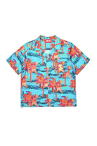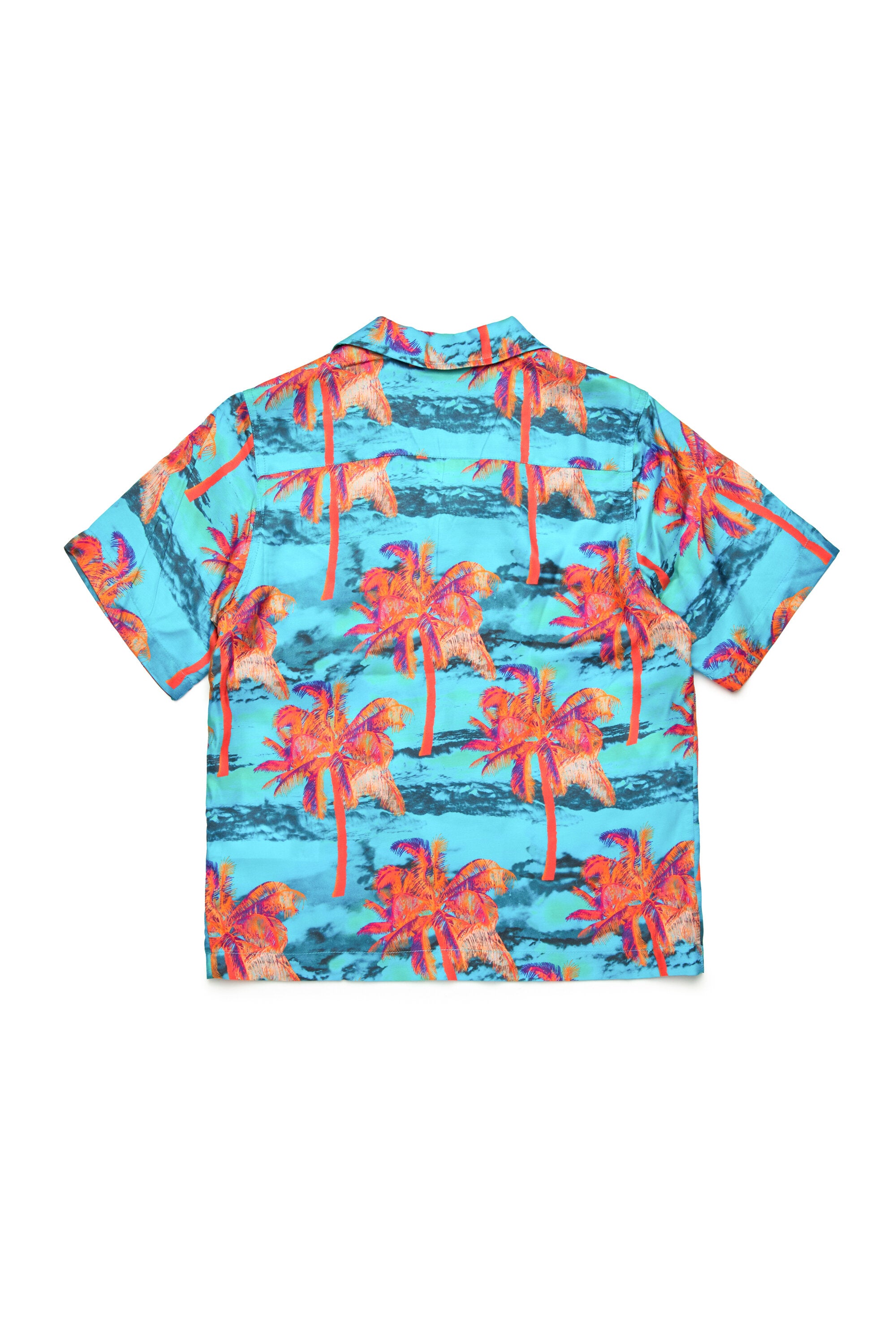 Chemise de bowling à manches courtes. Fabriqué en viscose avec un imprimé hawaïen allover avec des palmiers solarisés. Personnalisé avec le graphisme Diesel Palm fluo sur la poche avant.