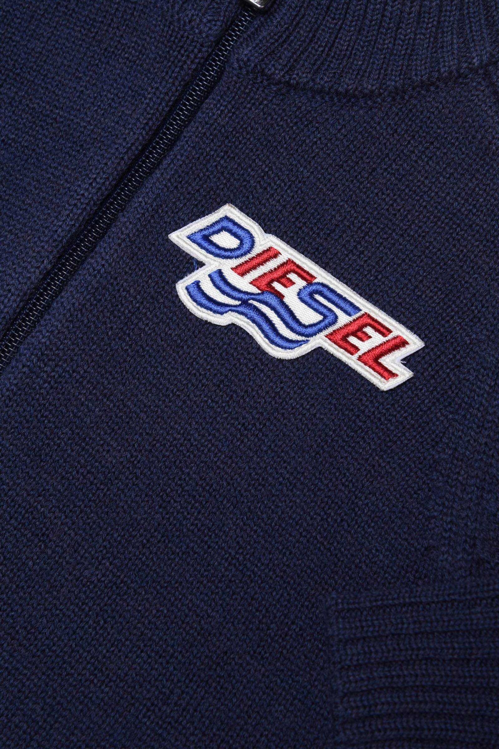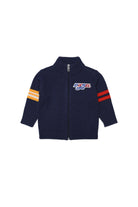 Blue full-zip cardigan with logo patch