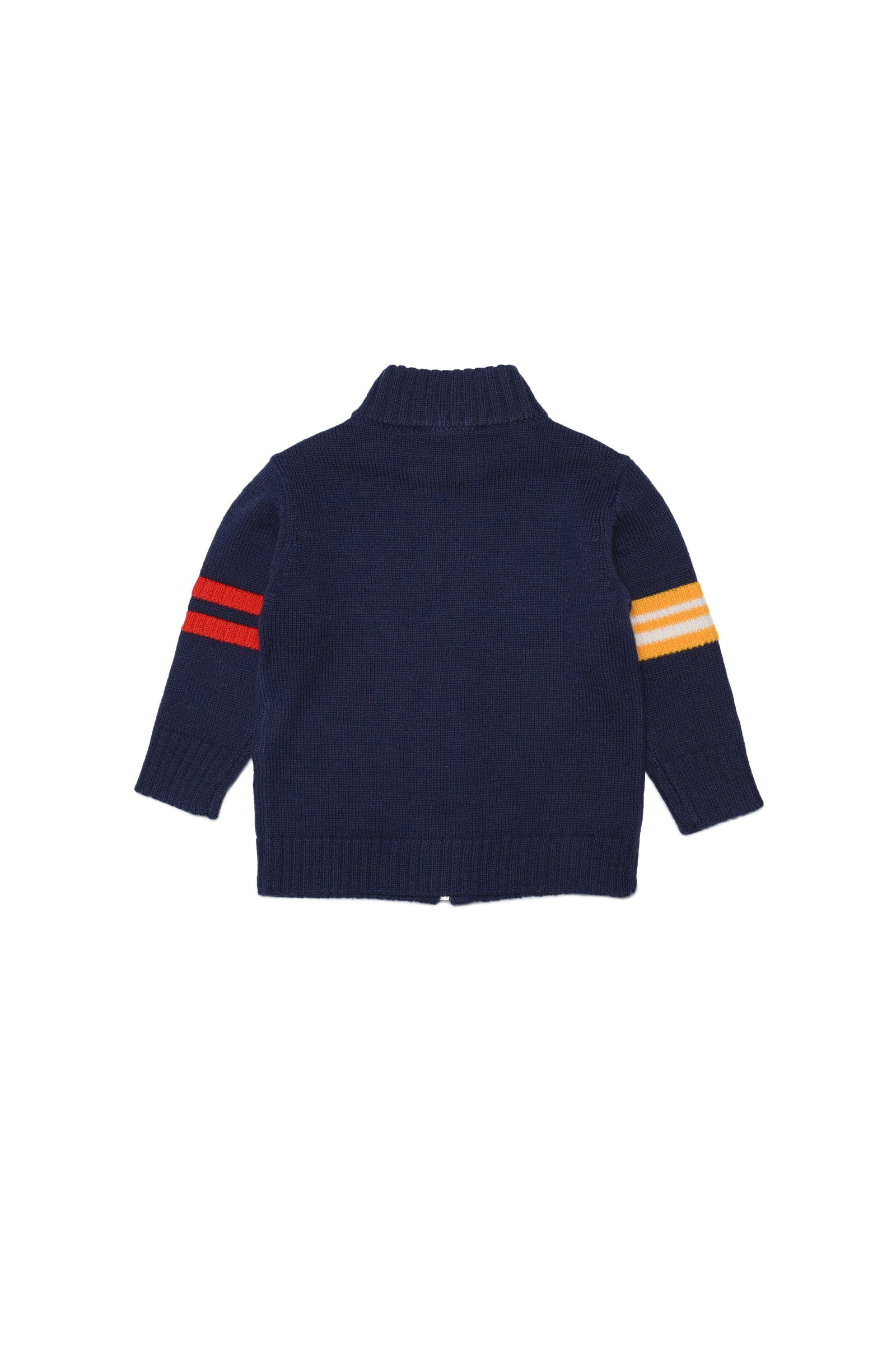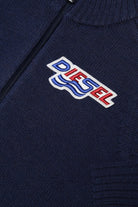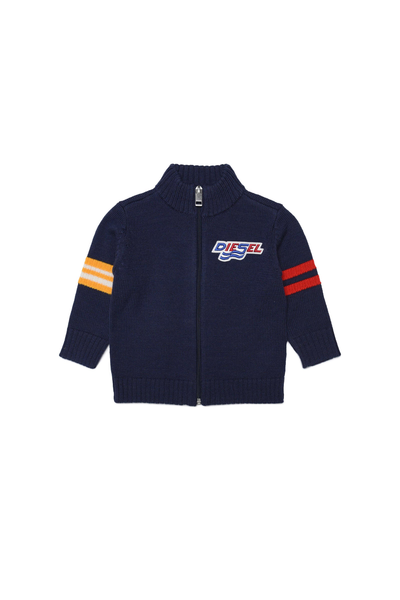 Blue full-zip wool blend cardigan with logo patch on left side and contrast band detail on both arms.