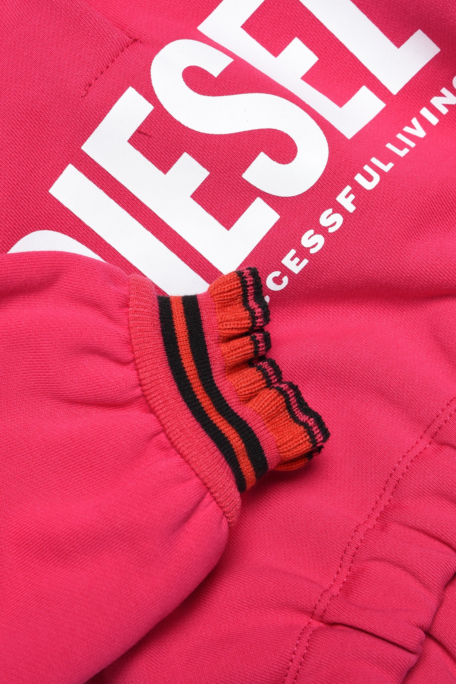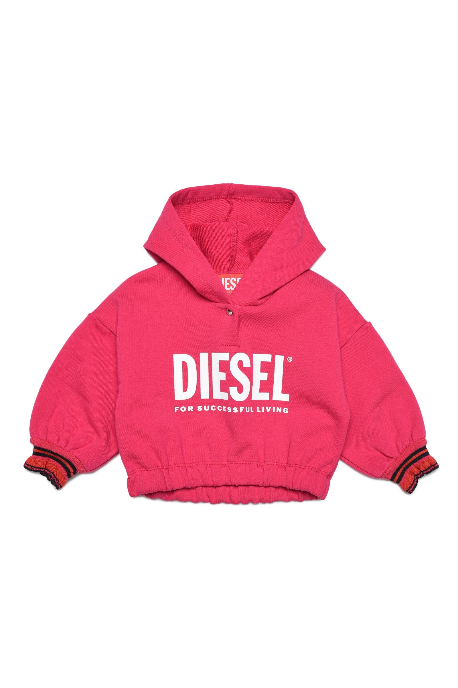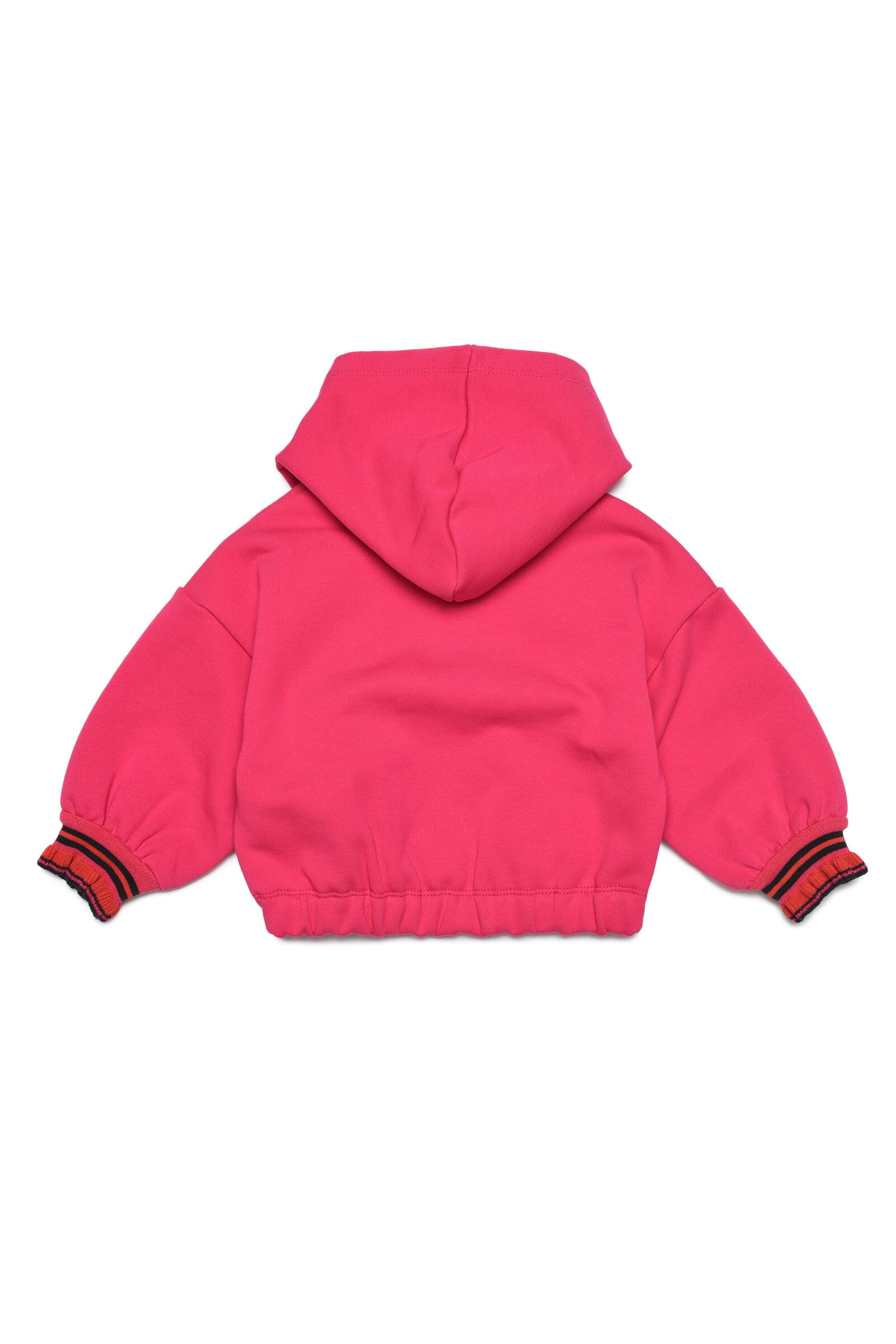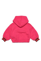 Long-sleeve pink hooded sweatshirt in French Terry cotton with contrasting color striped ribbed finish on cuffs, elastic at hem and contrast oversized logo detail on front.