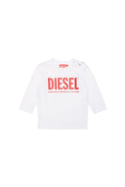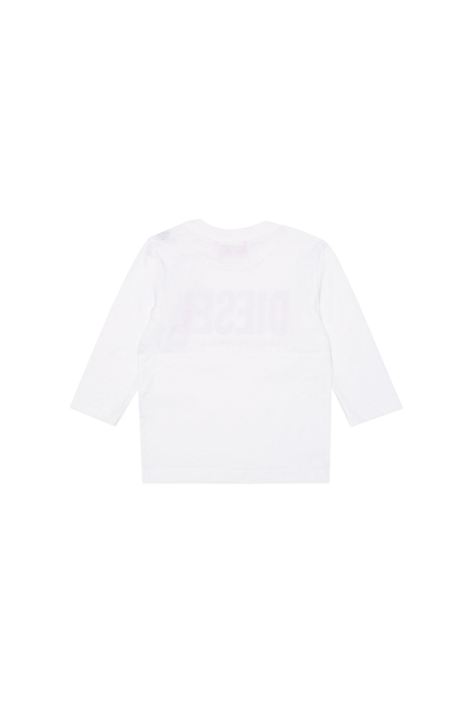 White crew neck t-shirt, press-stud closure on the shoulder, long-sleeve and with central contrasting color logo print detail. Made from 100% anti-pilling combed cotton.
