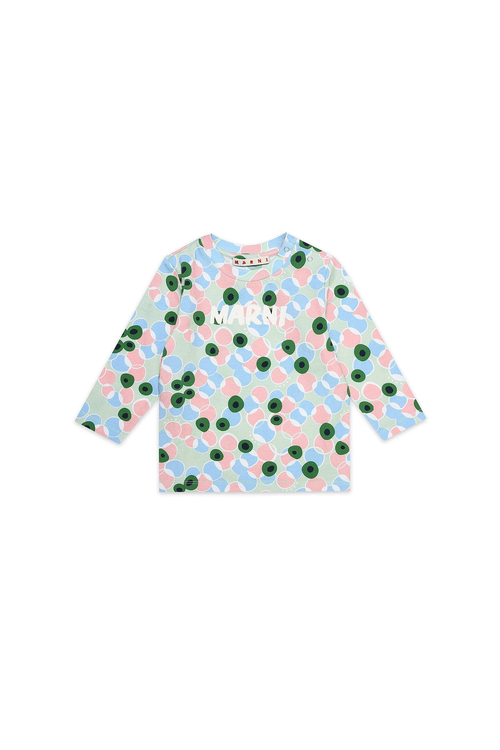 Long-sleeve, crew-neck stretch cotton jersey T-shirt with all-over bubbles print, fastening with buttons on the shoulder, and contrasting color brush Marni logo.
