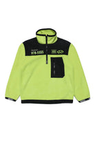 Après ski sweatshirt in soft fleece, perfect for the mountains, fluo yellow color, with black nylon inserts, front zip and front pocket.
