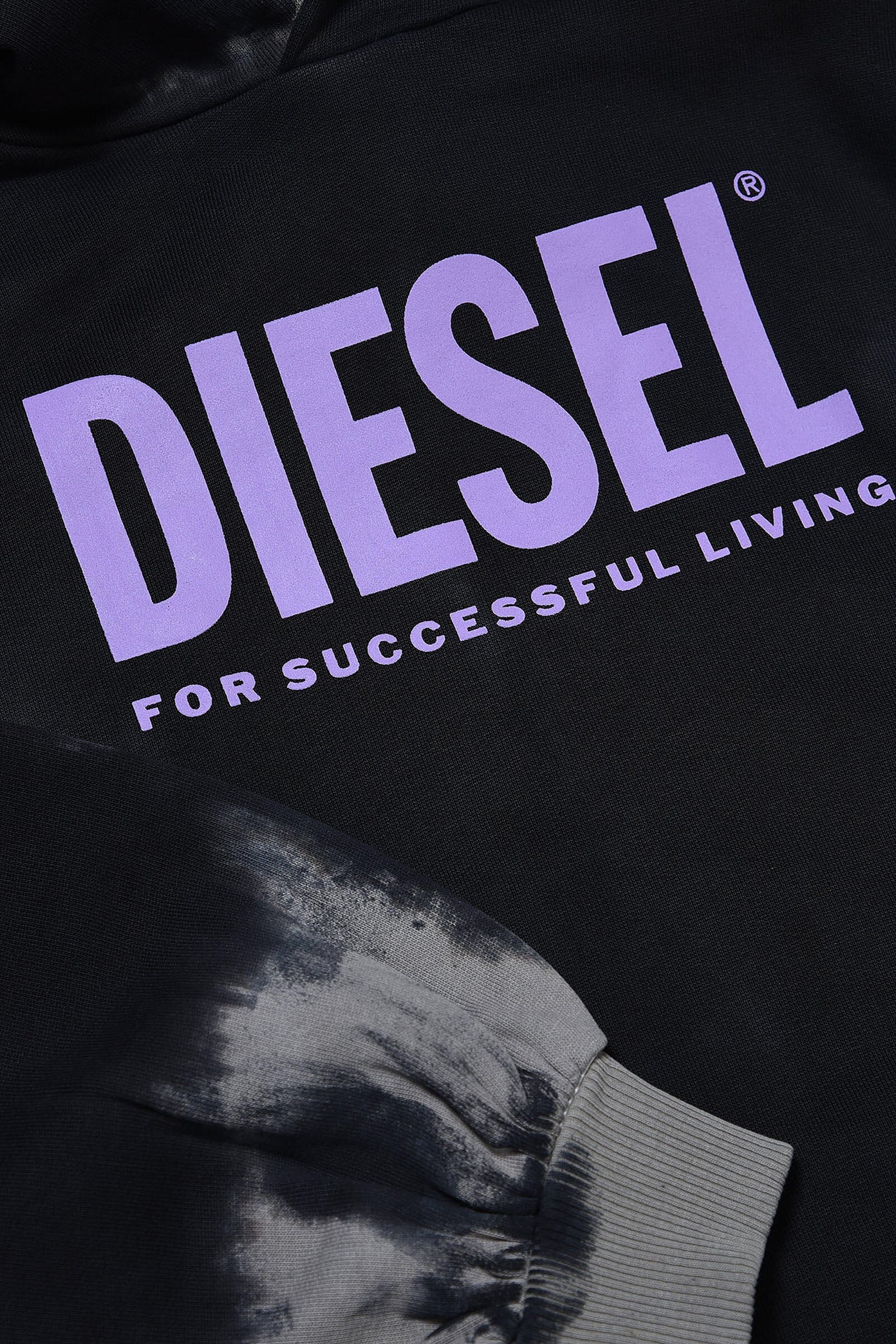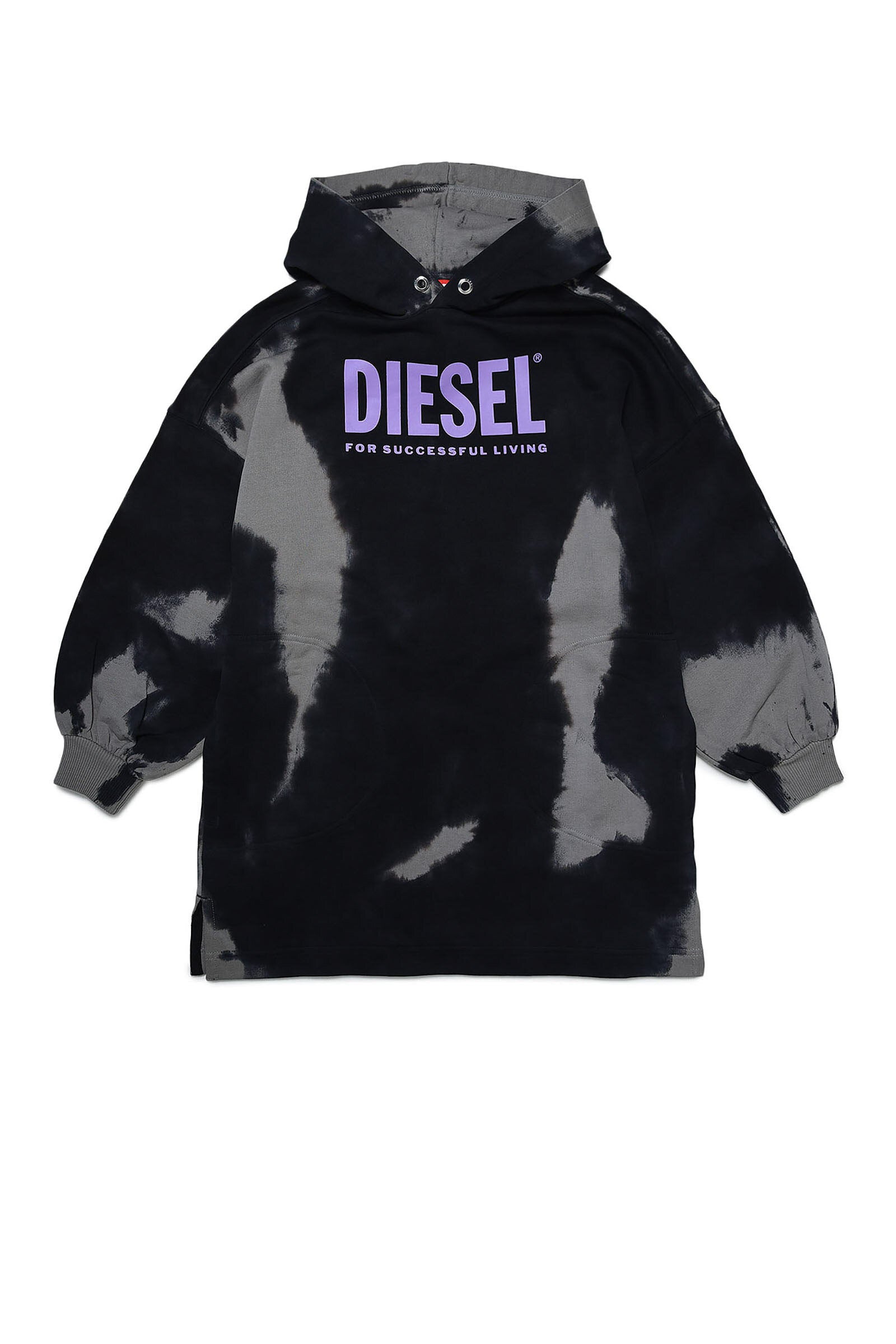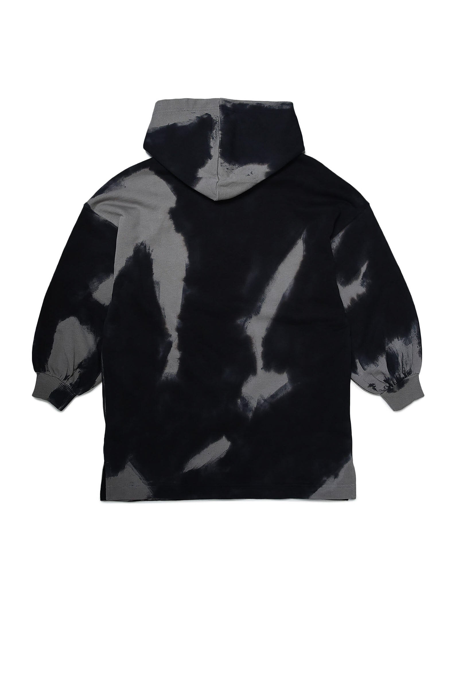 Gray tie dye-effect fleece dress, with hood, long-sleeve, with elasticated cuffs and contrast oversized front logo detail.