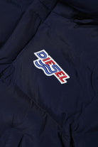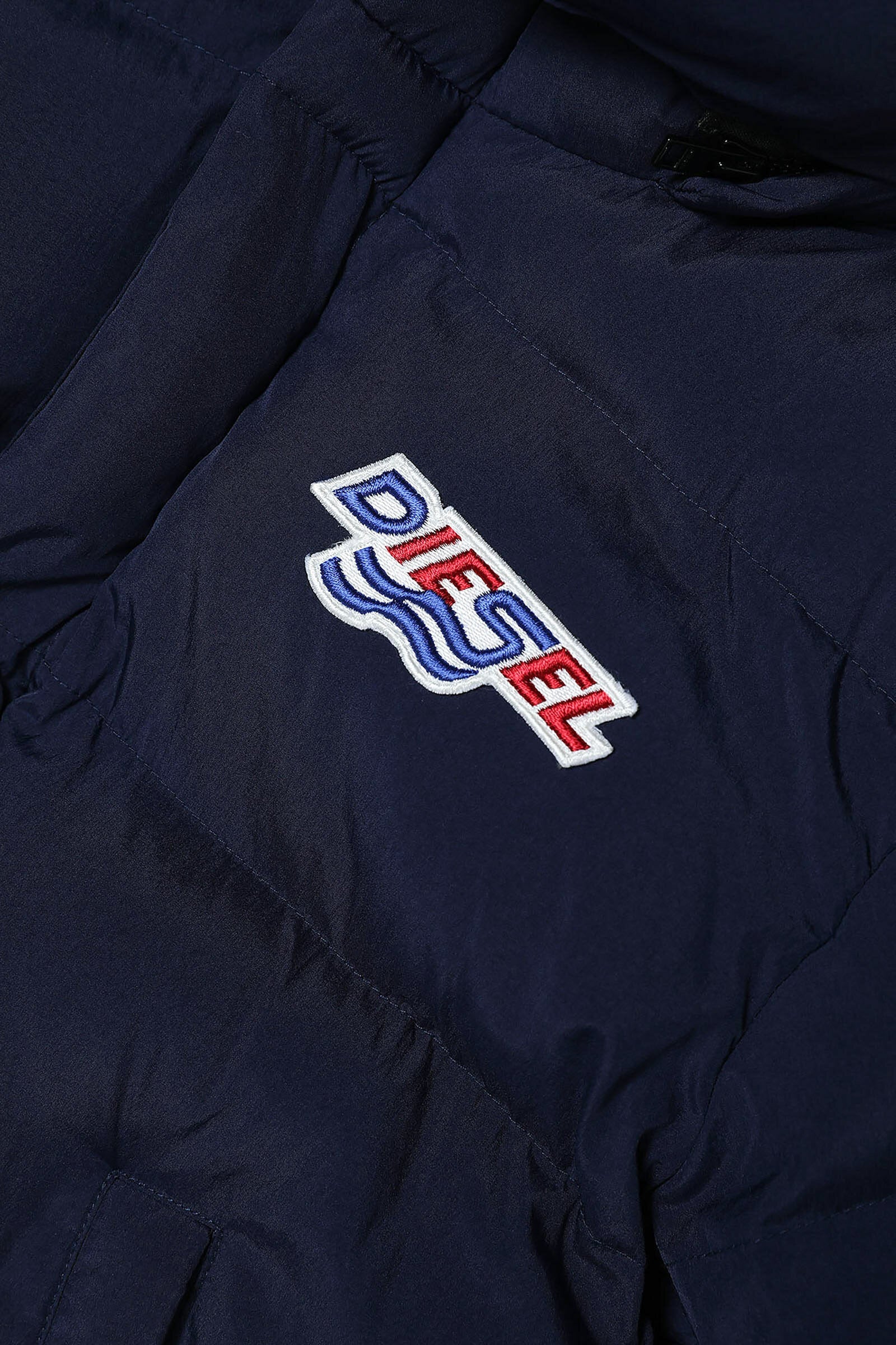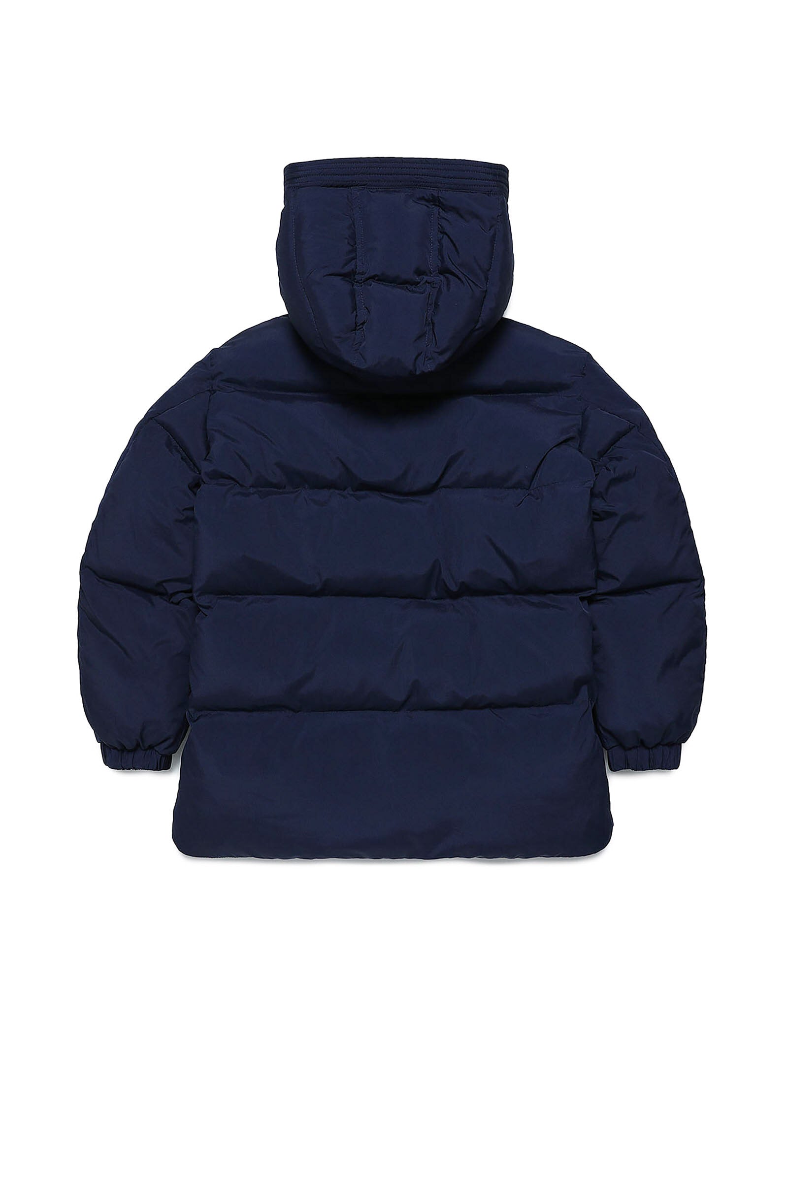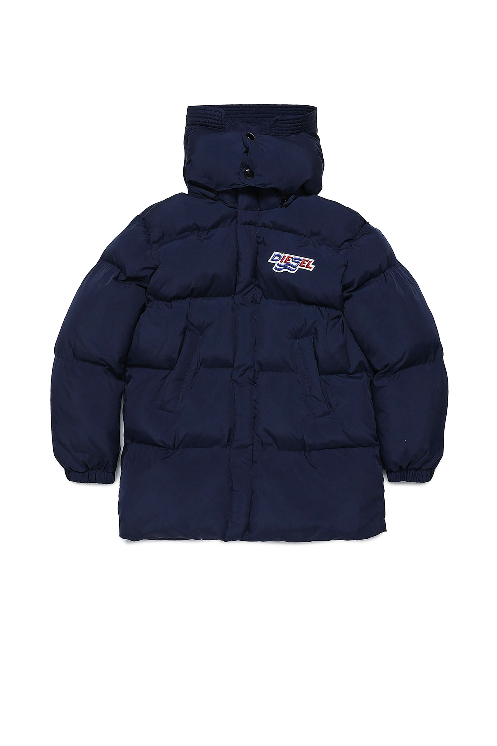 Long dark blue quilted jacket in fake down, with high neck, two-button closure, detachable hood, double zip and hidden press-stud closure, side pockets, long-sleeve with elastic cuff and colored logo patch print detail on top left.