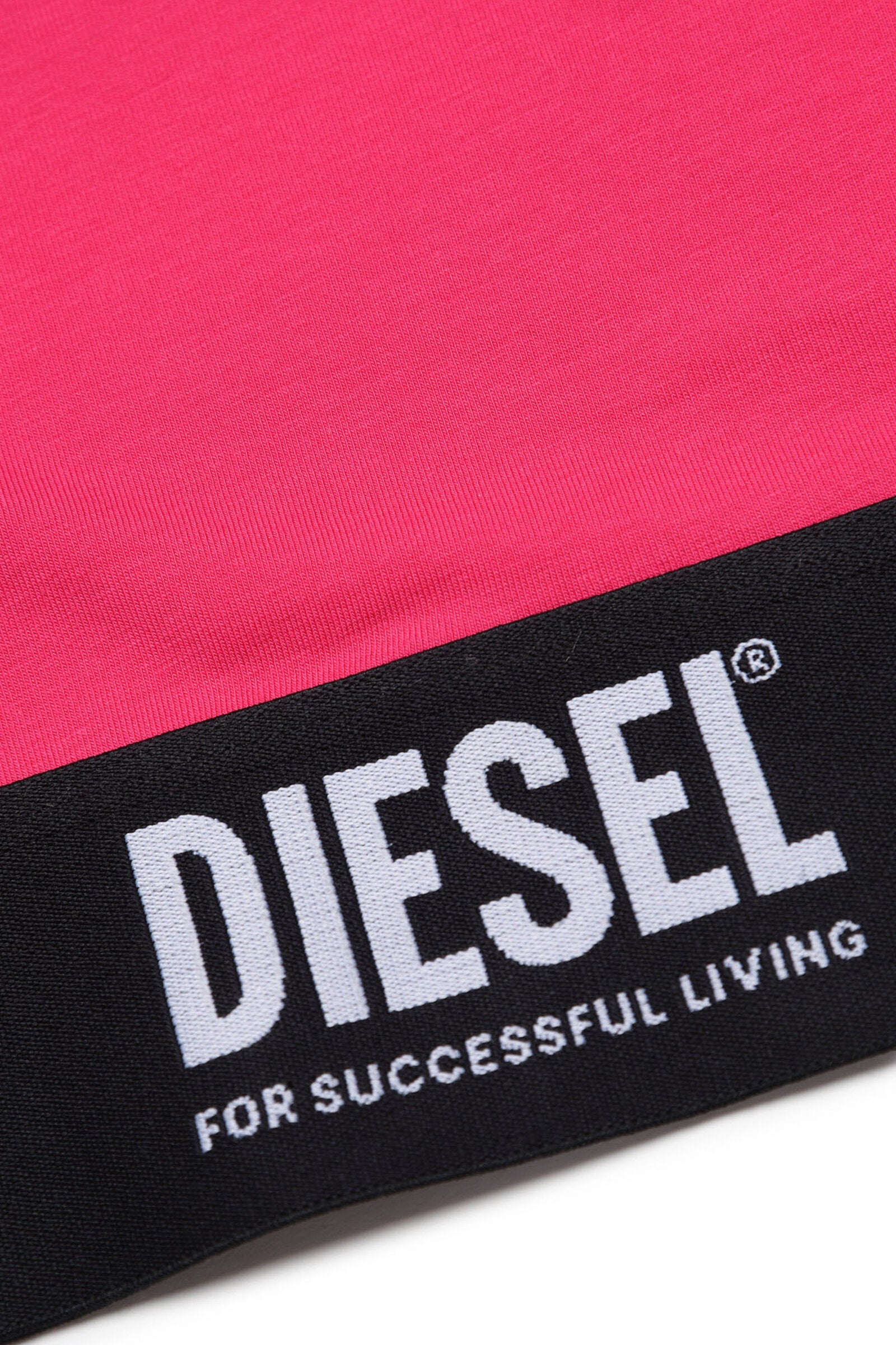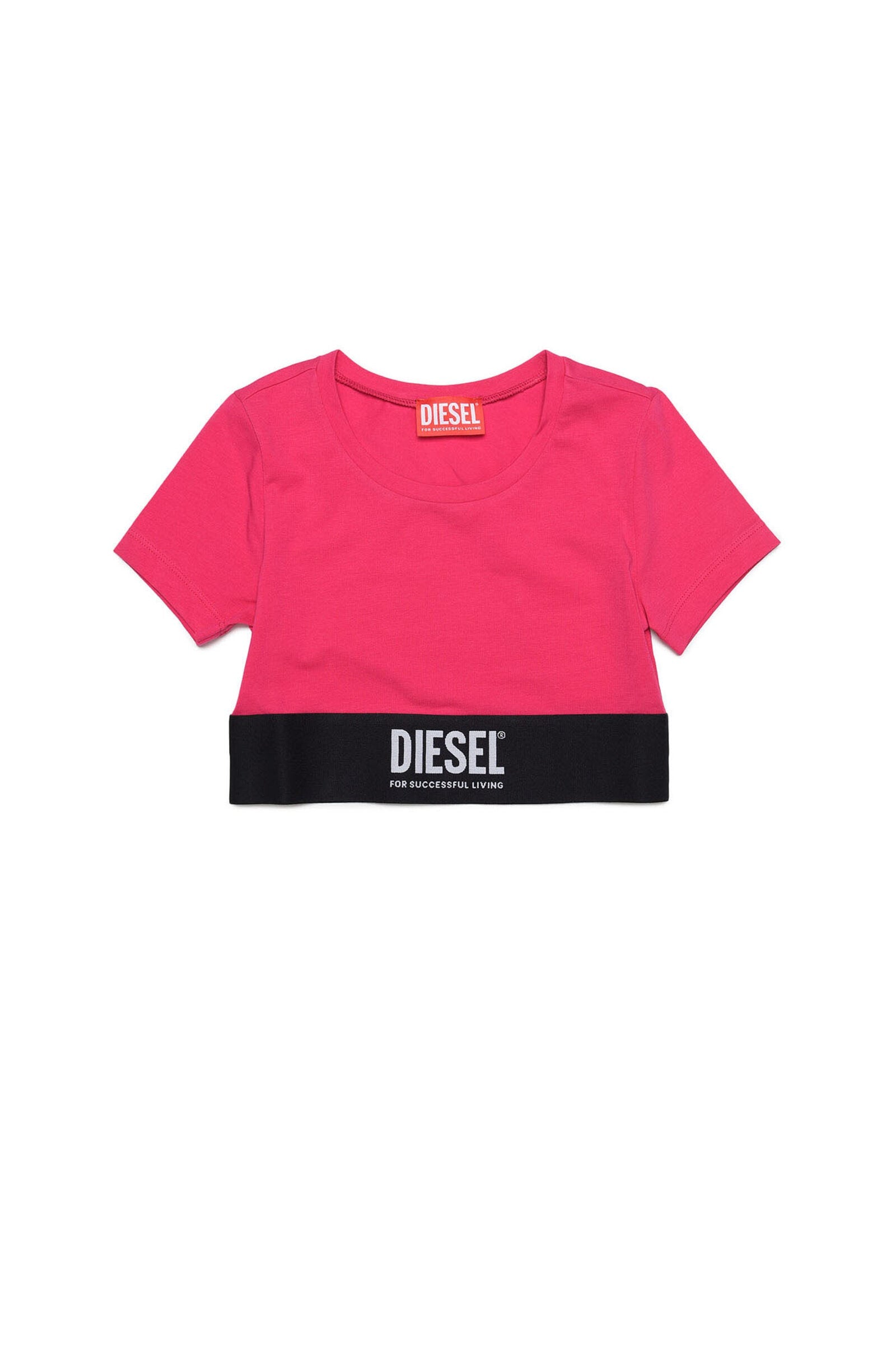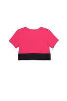 Pink short-sleeve crew neck t-shirt with contrasting color elastic logo band on hem.