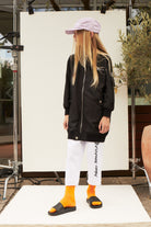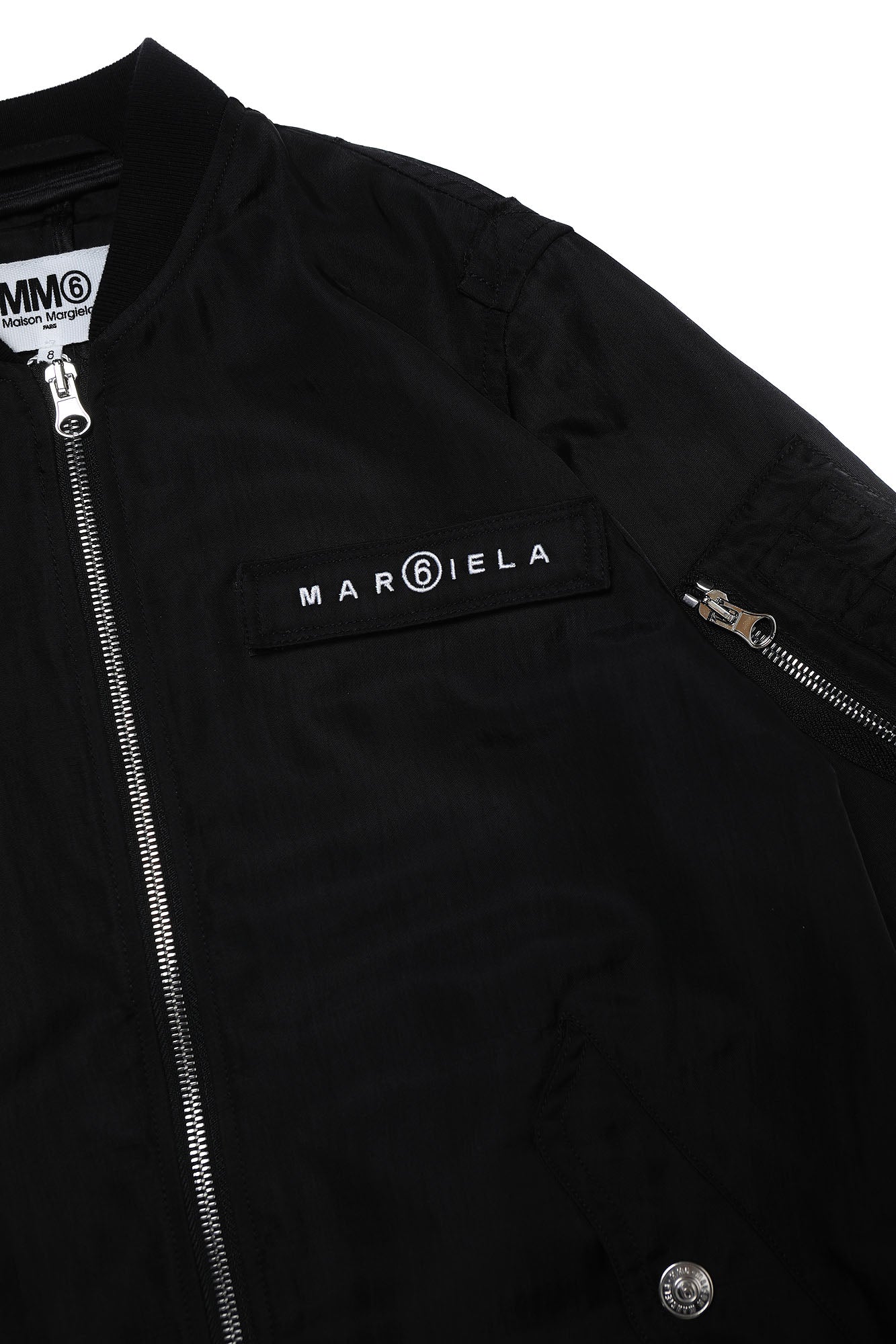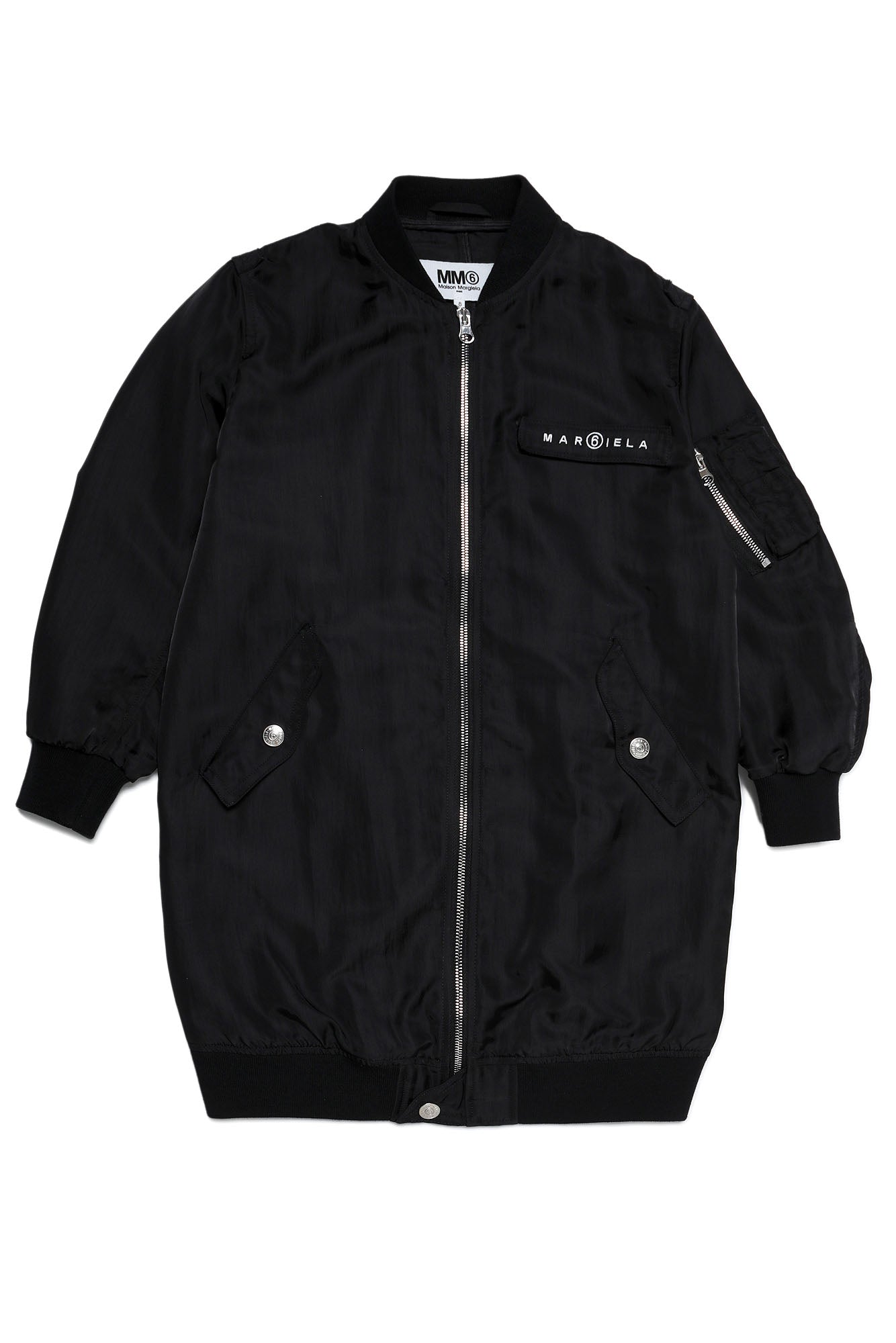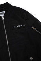 Black outerwear, over bomber model, with front zip opening, with pockets with metal button closure, with ribbed finish on the collar, armholes and hem, and contrasting Margiela logo at the top left.