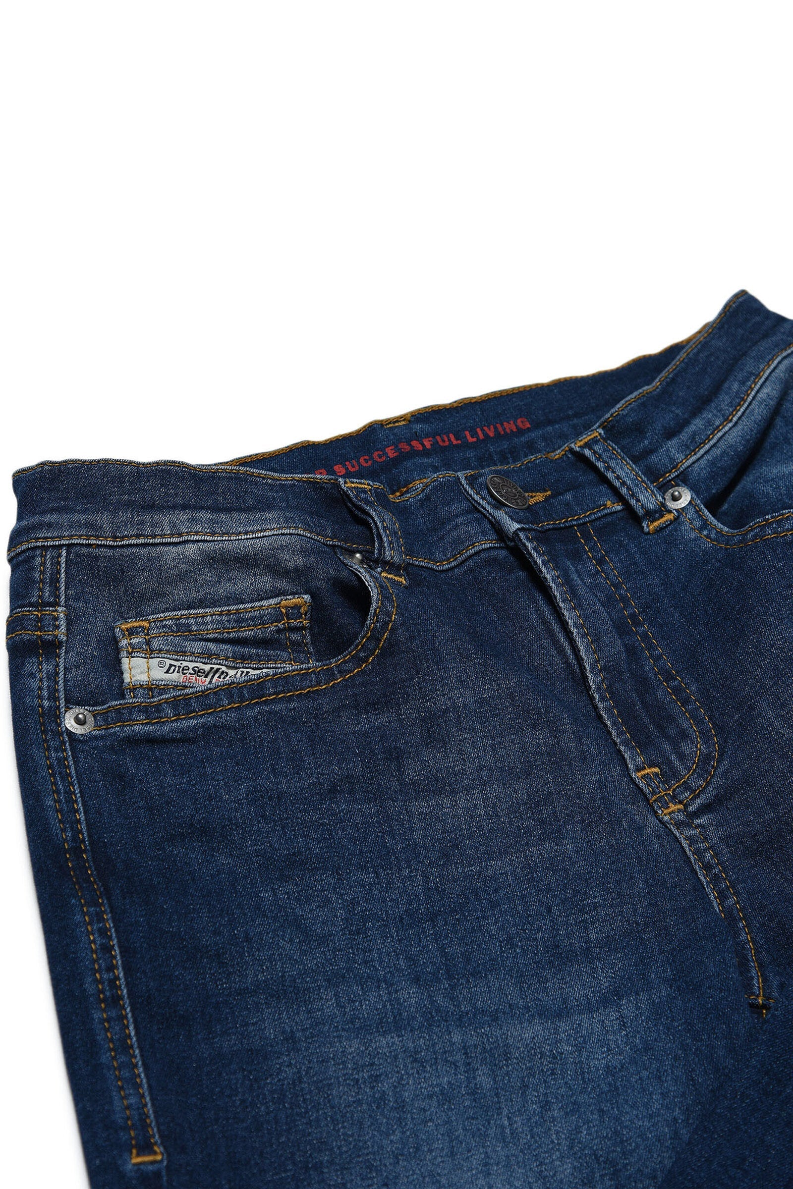 Five-pocket jeans with clean look, straight fit, high rise, in medium blue used-effect stretch denim.