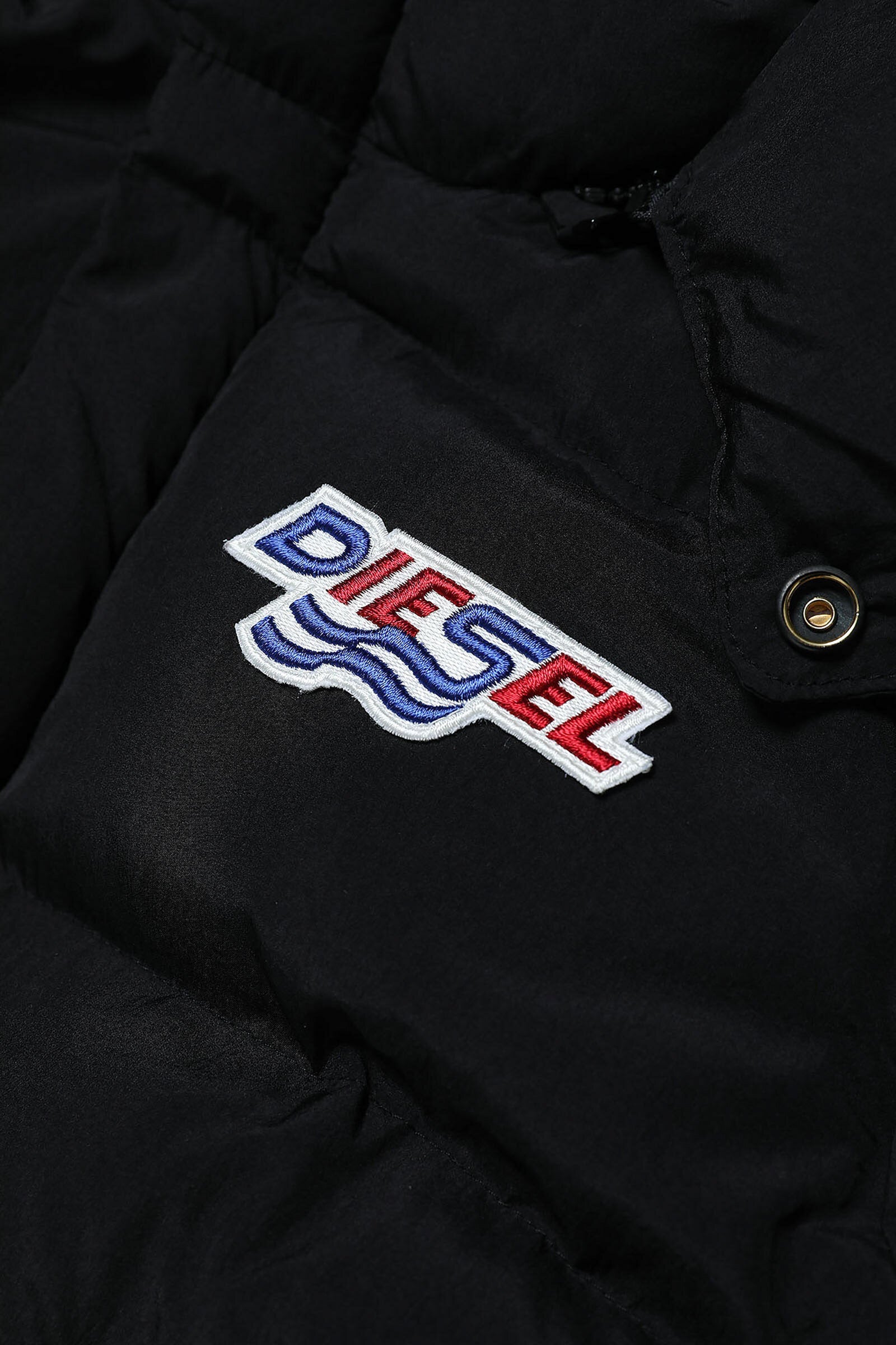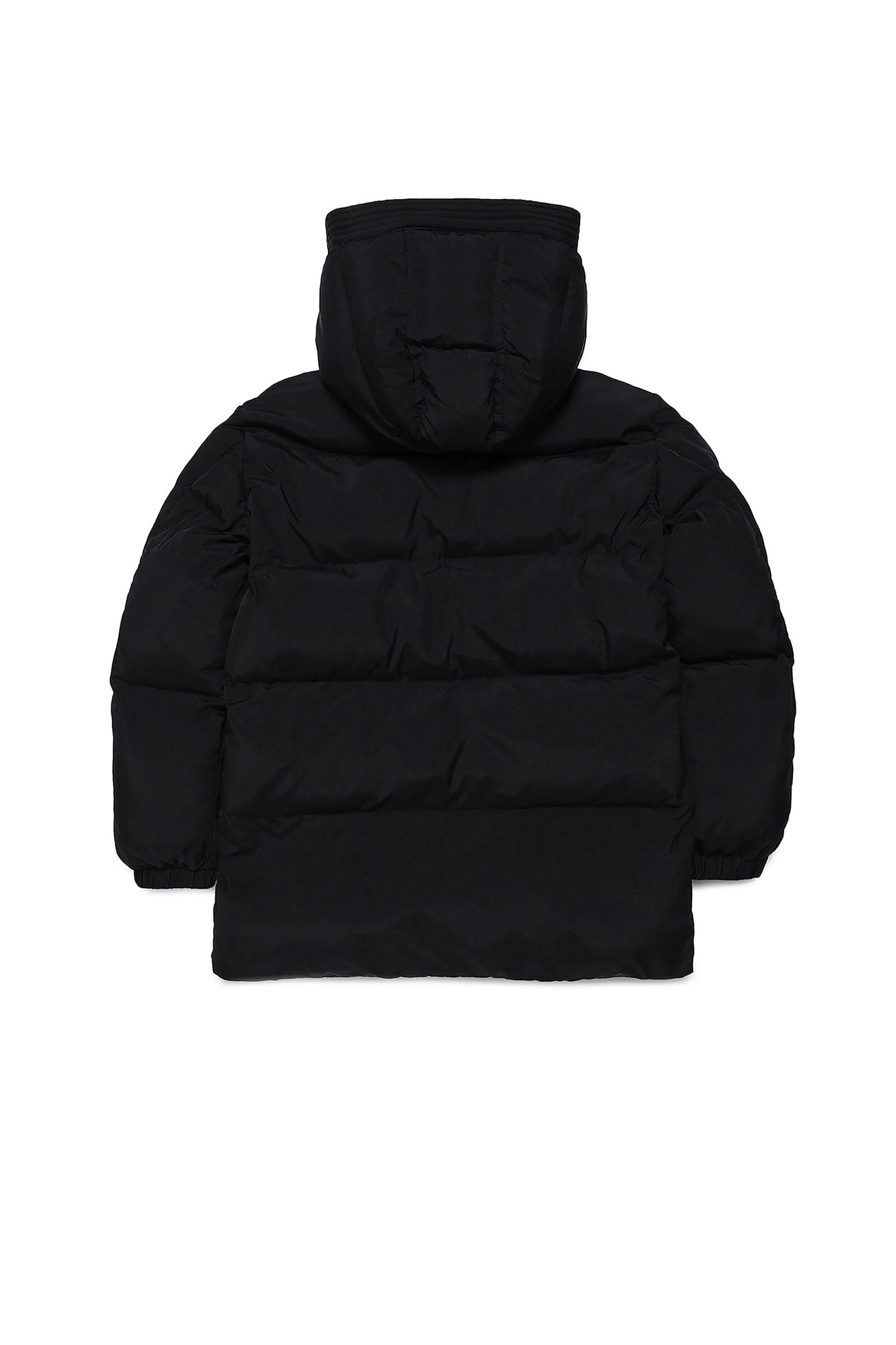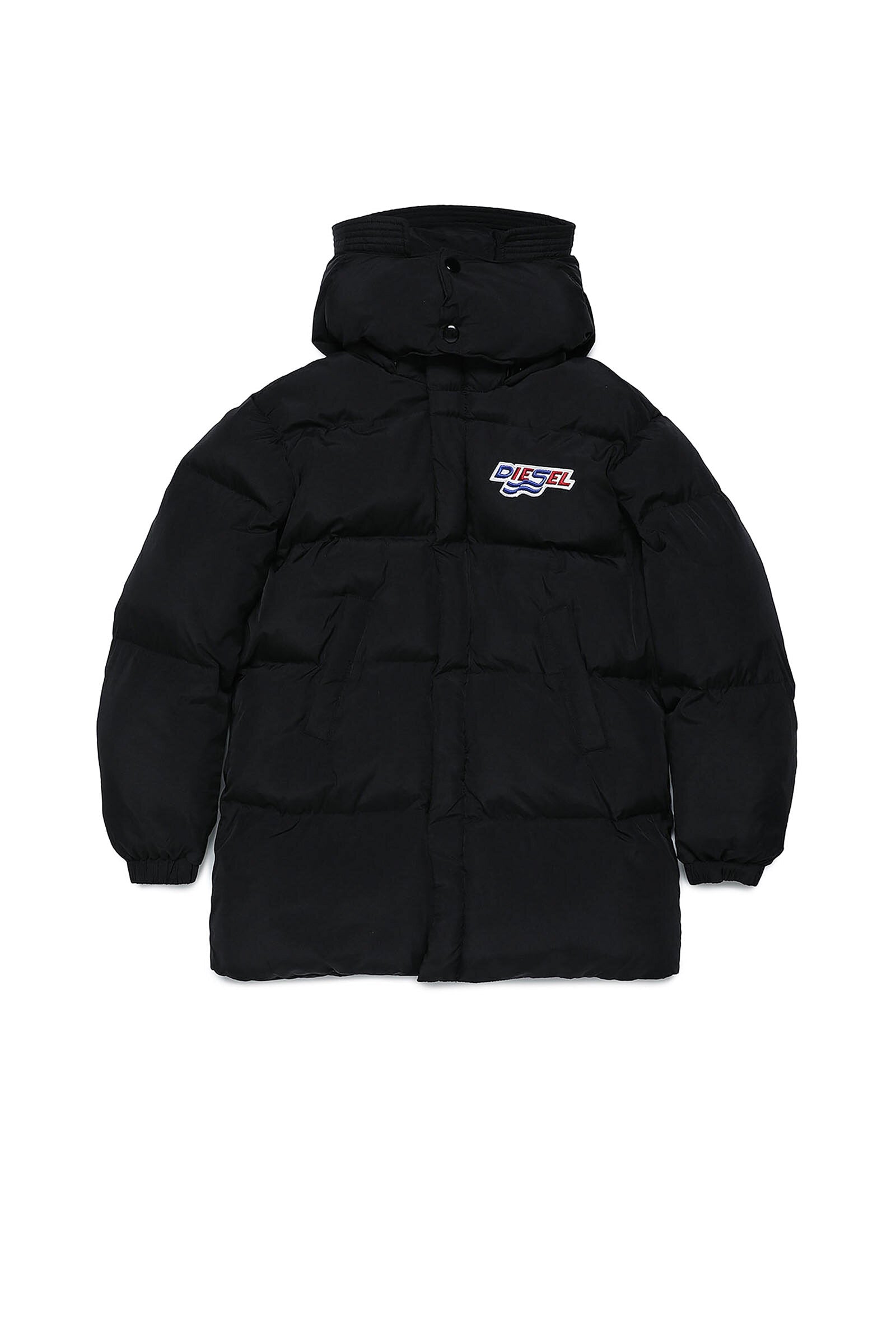 Long black quilted jacket in fake down, with high neck, two-button closure, detachable hood, double zip and hidden press-stud closure, side pockets, long-sleeve with elastic cuff and colored logo patch print detail on top left.