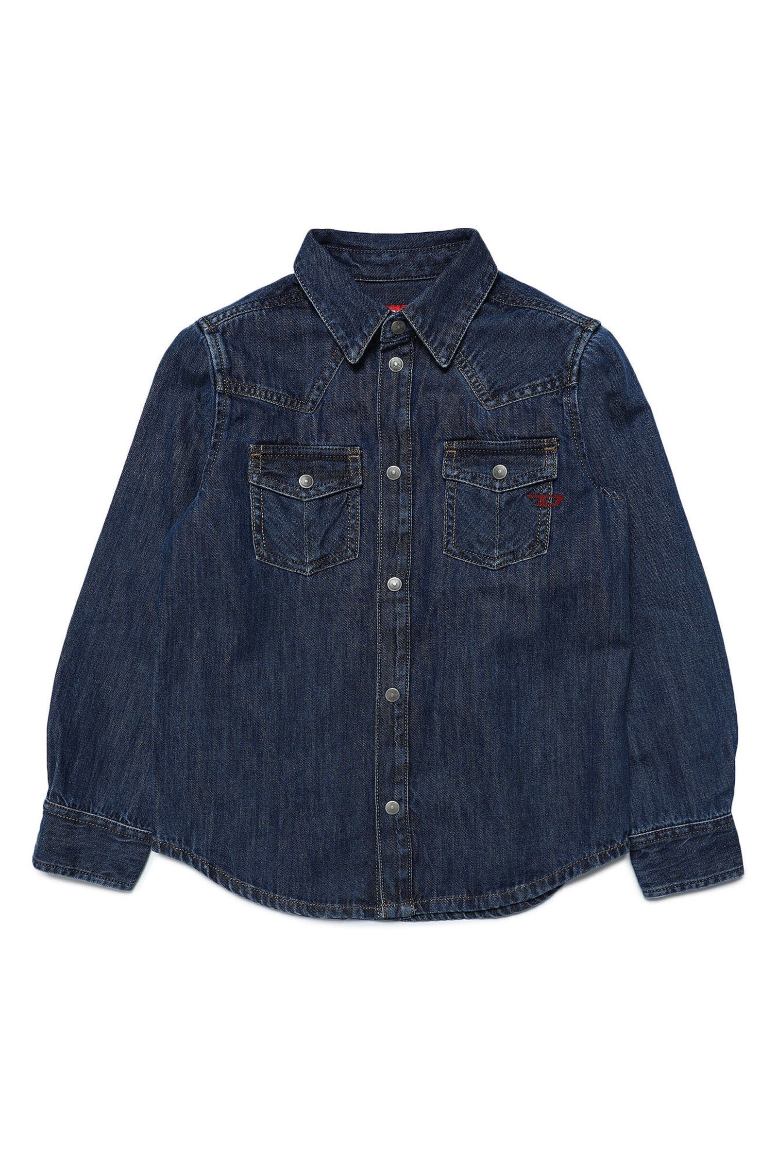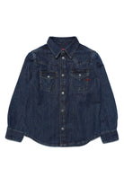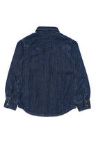 Blue light denim shirt with collar, long-sleeve, front button closure and front pockets. Part of the Library capsule collection, created with sustainable treatments.