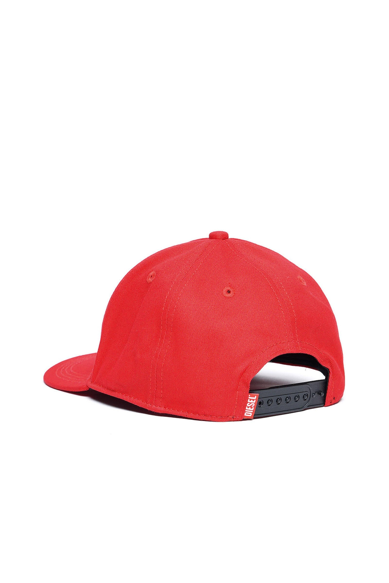 Red baseball cap, Folly model, with flat visor, adjustable closure and contrast Diesel logo detail.