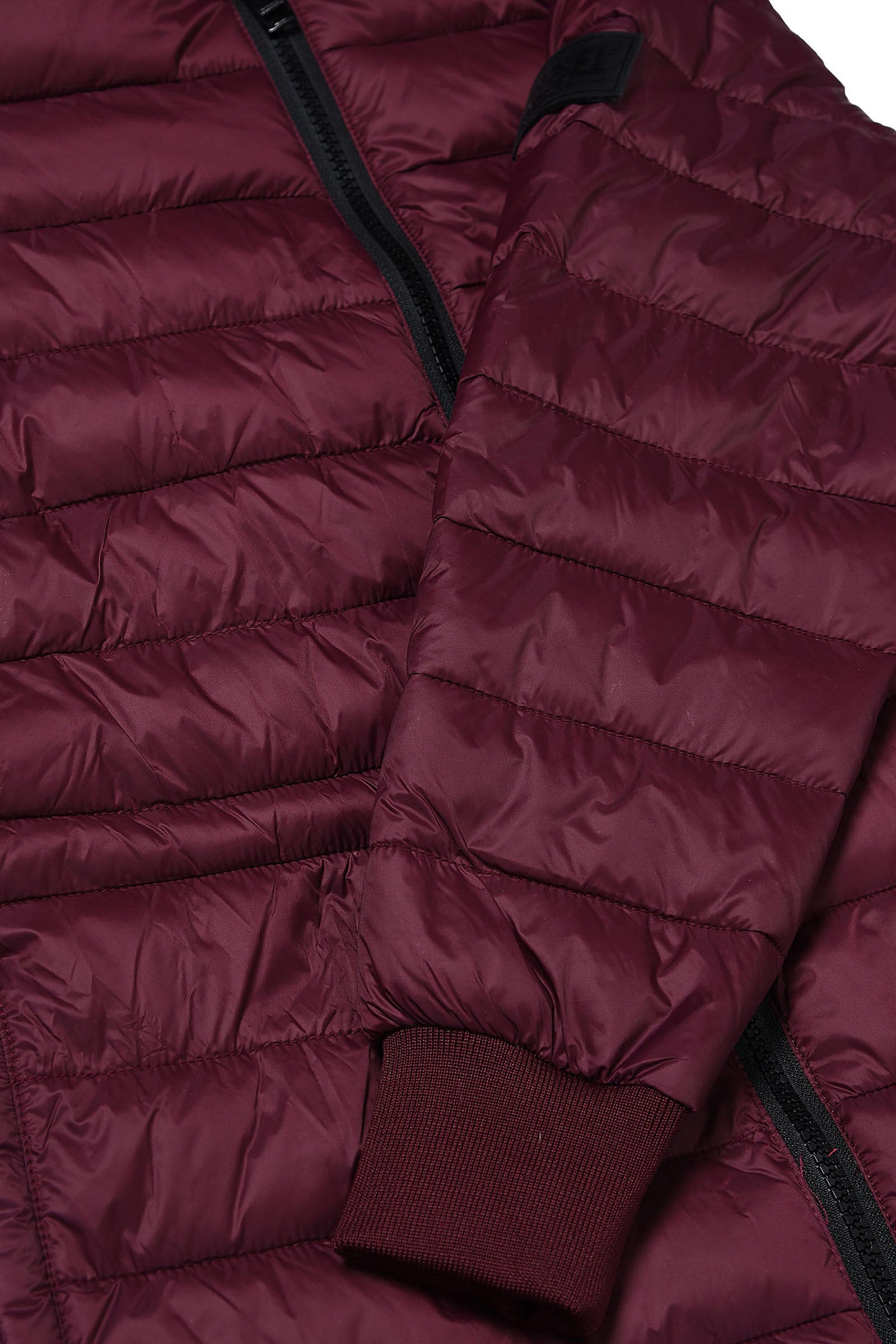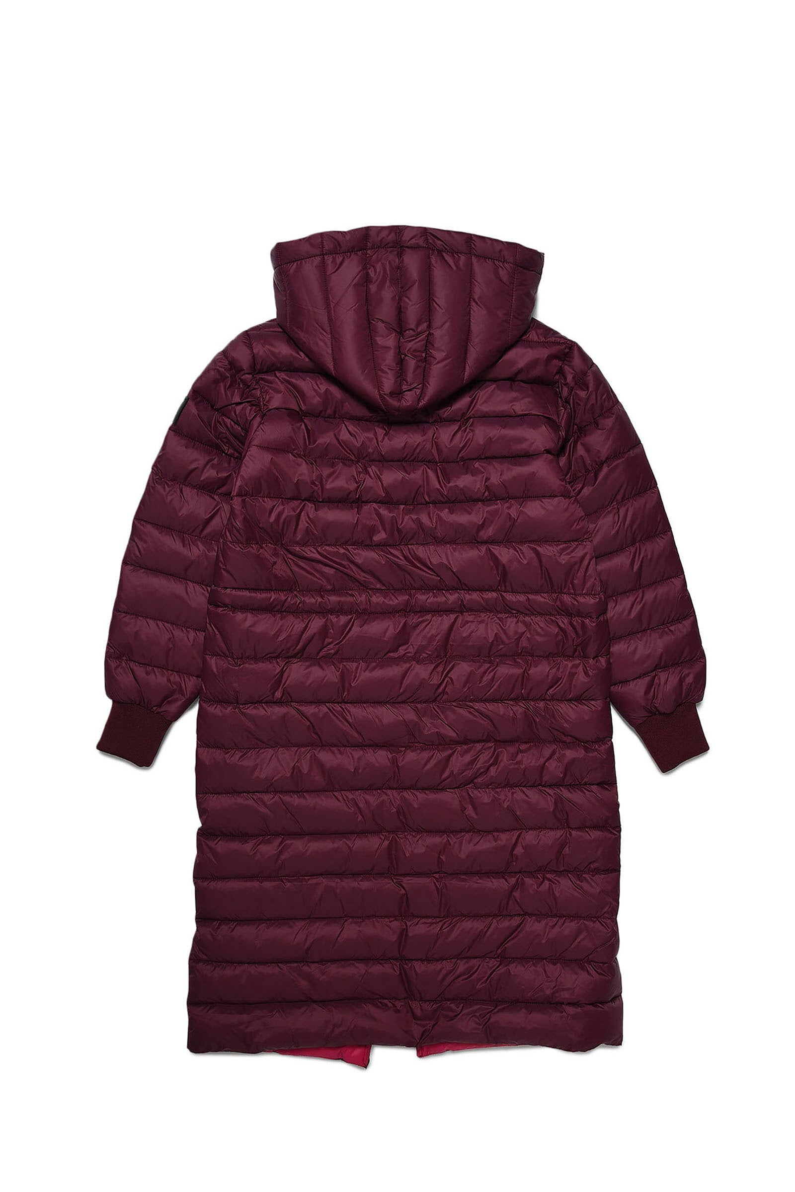 Lightweight long burgundy quilted jacket in fake down with horizontal quilting, hood, contrasting color lining, drawstring waist, front zip closure and front pockets with contrasting color zip closure.