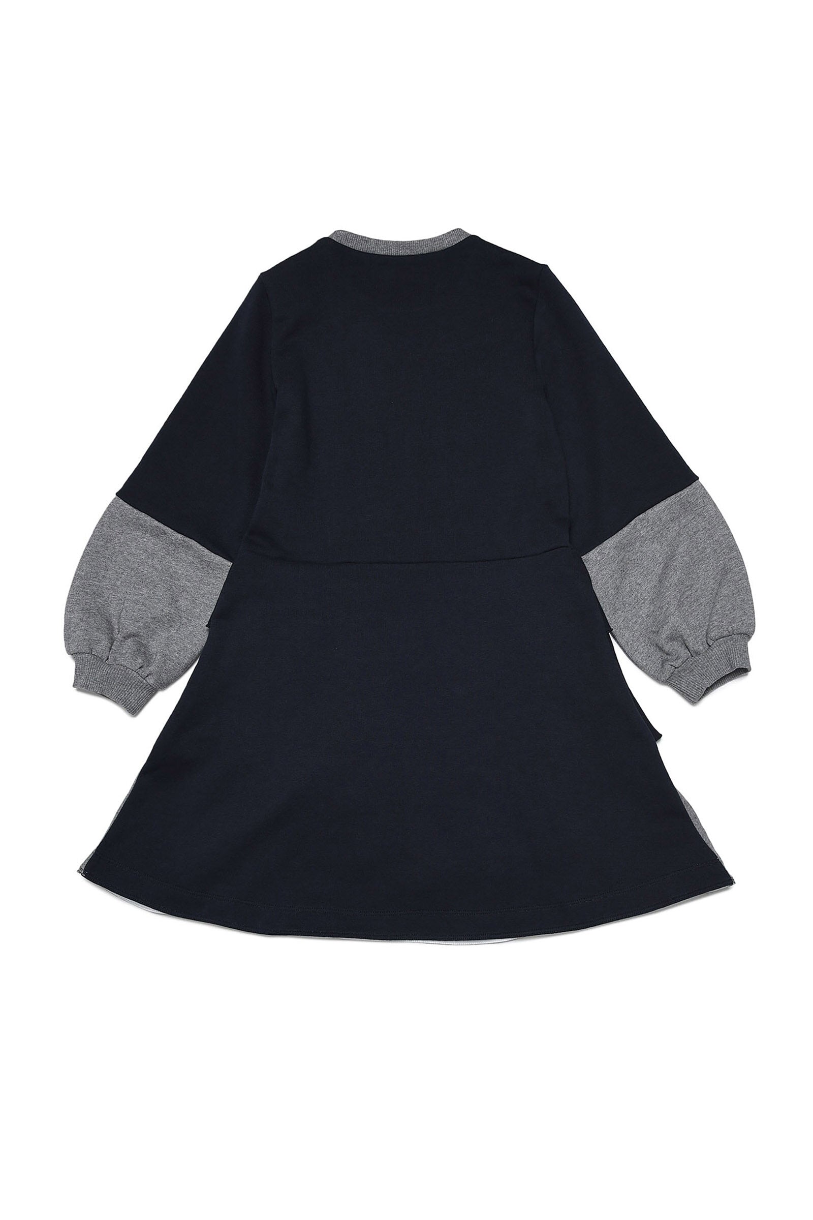 Long-sleeve, crew-neck navy blue fleece dress with contrasting color gray inserts on the crew neck, sleeves and hem, flounced skirt and contrasting color front logo detail.