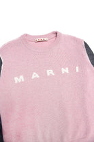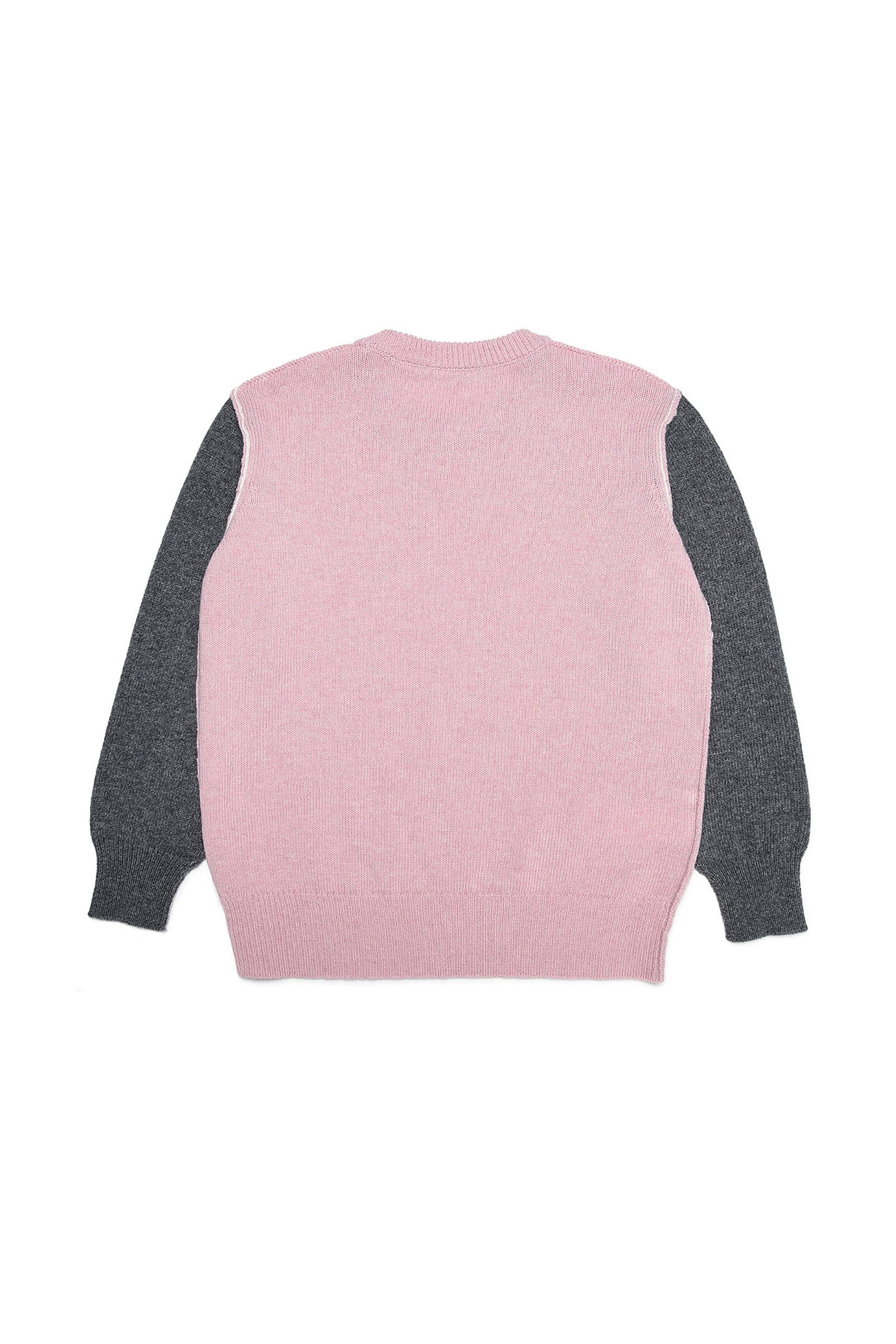 Long-sleeve, crew-neck pink wool blend sweater with visible outer stitching, contrasting color sleeves, ribbed hem and institutional logo on the front.