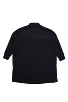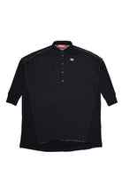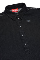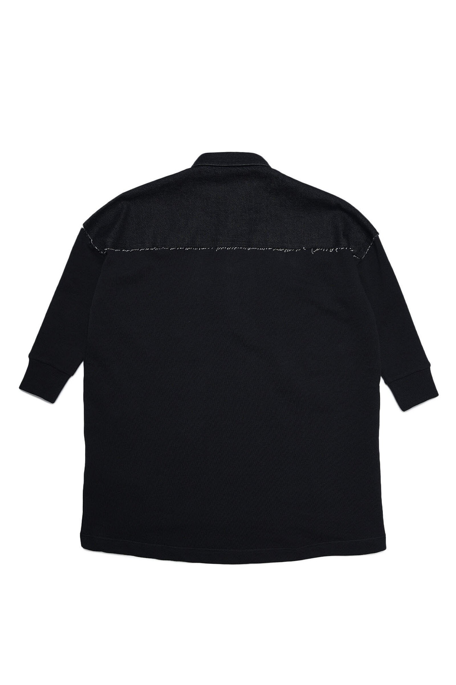 Black dress with collar, in denim on the front and fleece on the back, raw hem, button detailing on upper part and D appliqué on left side. Part of the Back To School collection.
