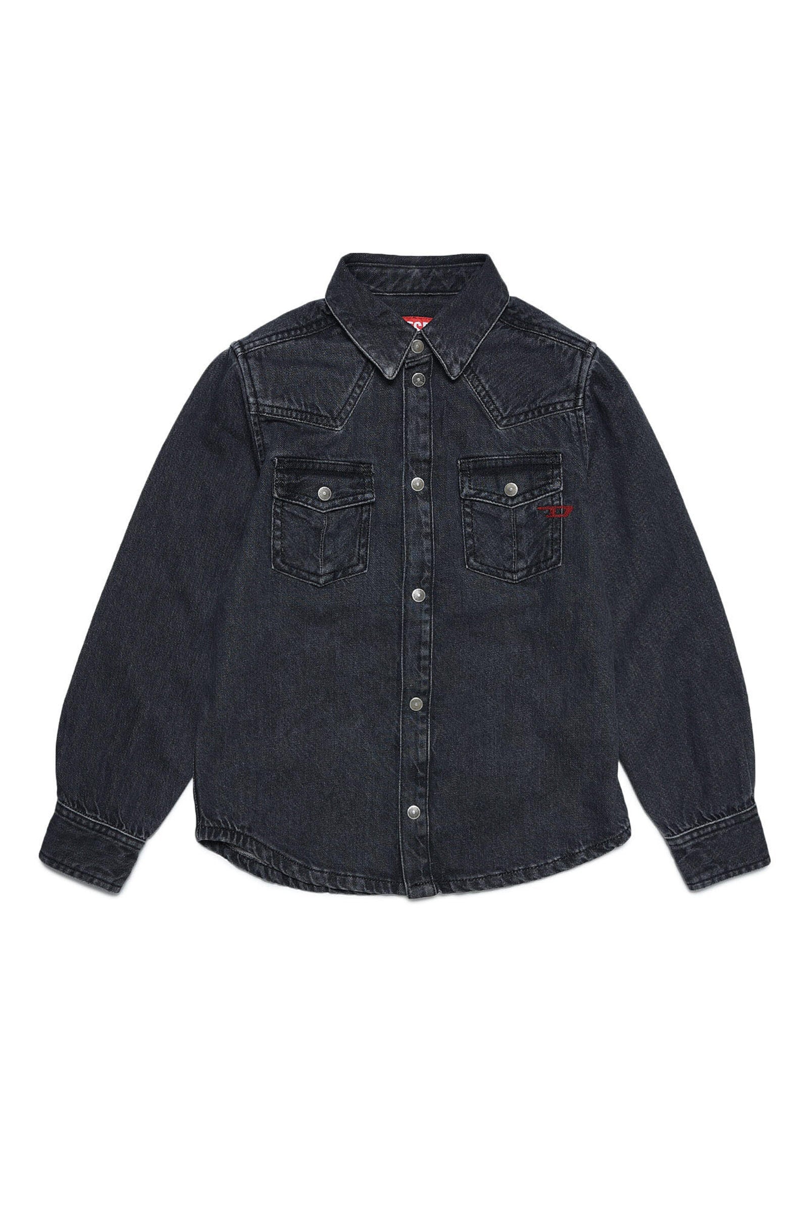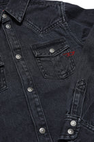 Black light denim shirt with collar, long-sleeve, front button closure and front pockets. Part of the Library capsule collection, created with sustainable treatments.
