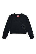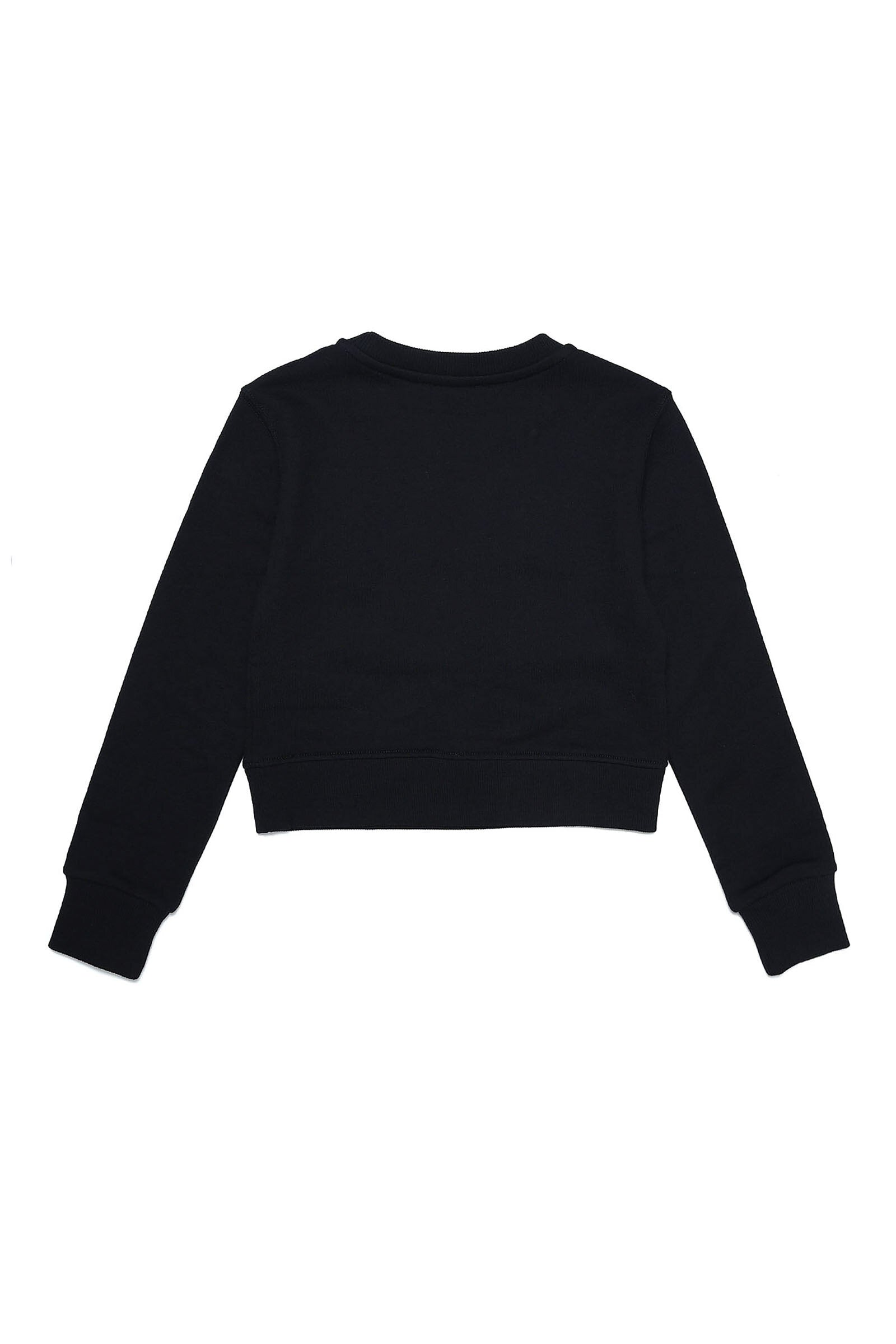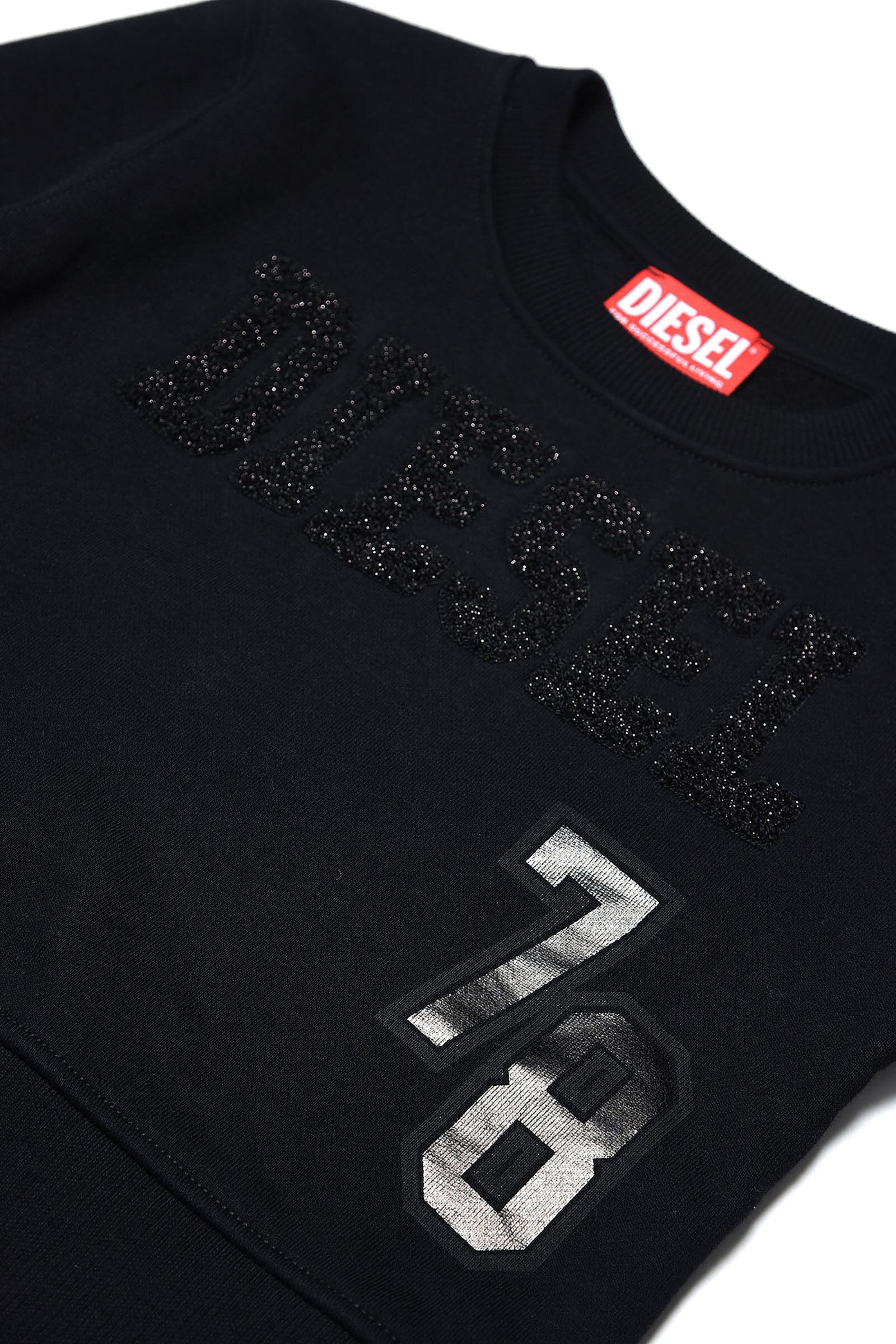 Black cotton sweatshirt, crew-neck model, long sleeve, with "Diesel" logo appliqué in terry cloth with lurex thread and silver mylar print on the left side of the garment.