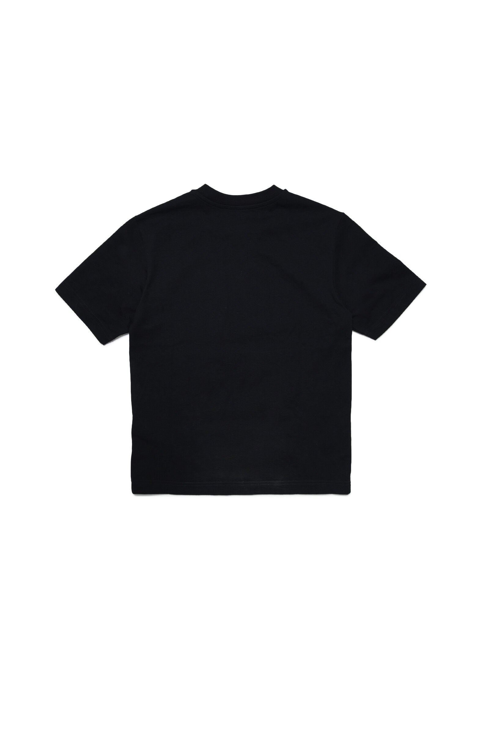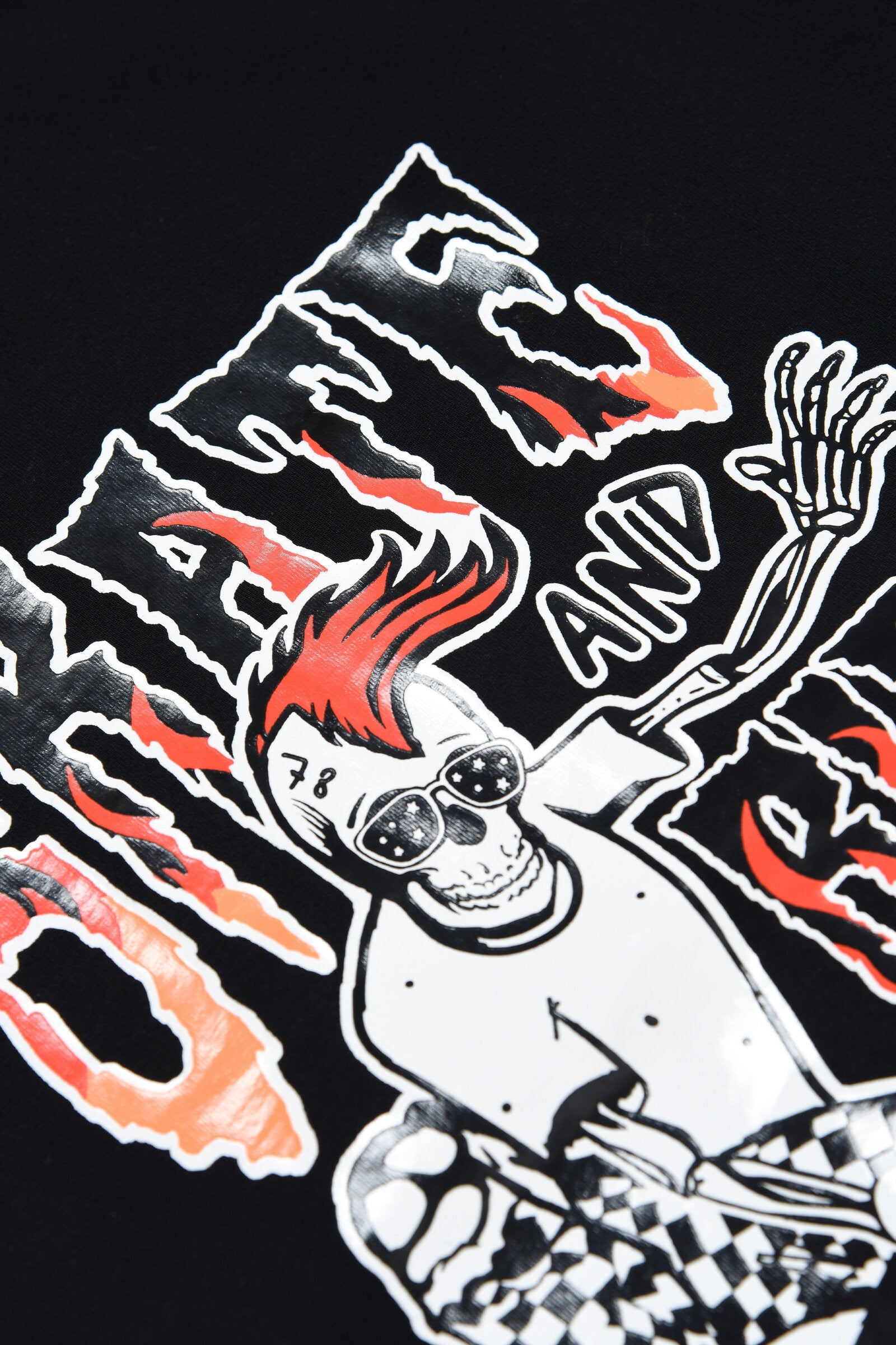 Black short-sleeve crew neck t-shirt with front contrasting color print detail. Part of the Skate capsule collection, inspired by the skater style.