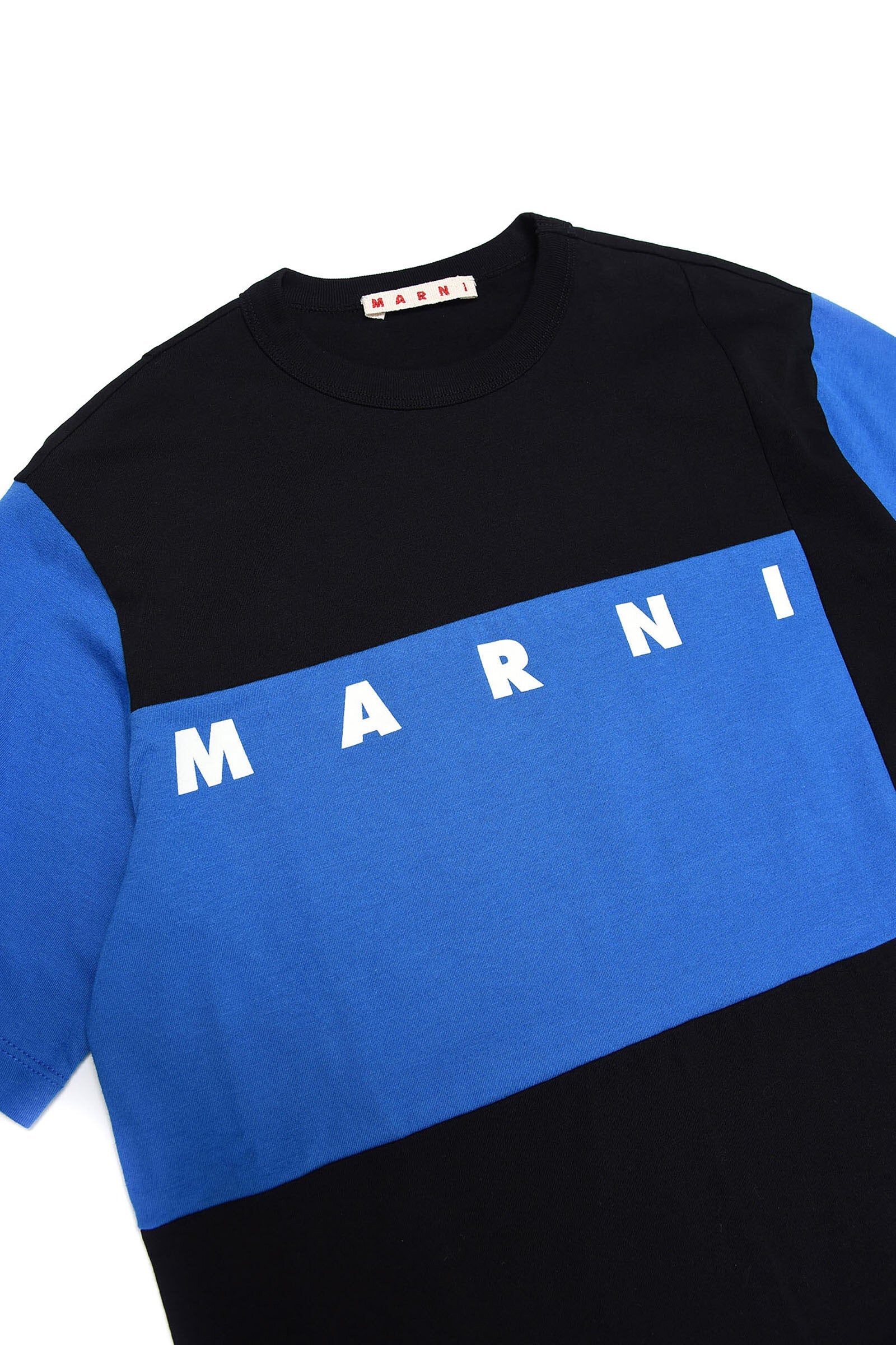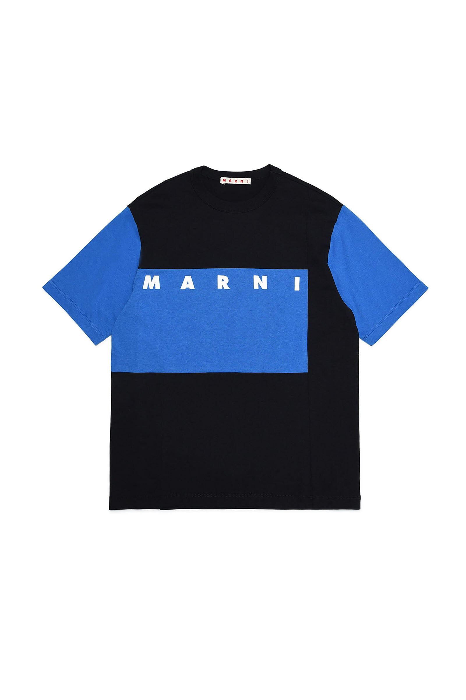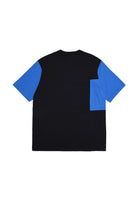 Crew-neck black cotton jersey T-shirt with contrasting color short sleeves with a colorblock effect and contrasting color institutional logo.