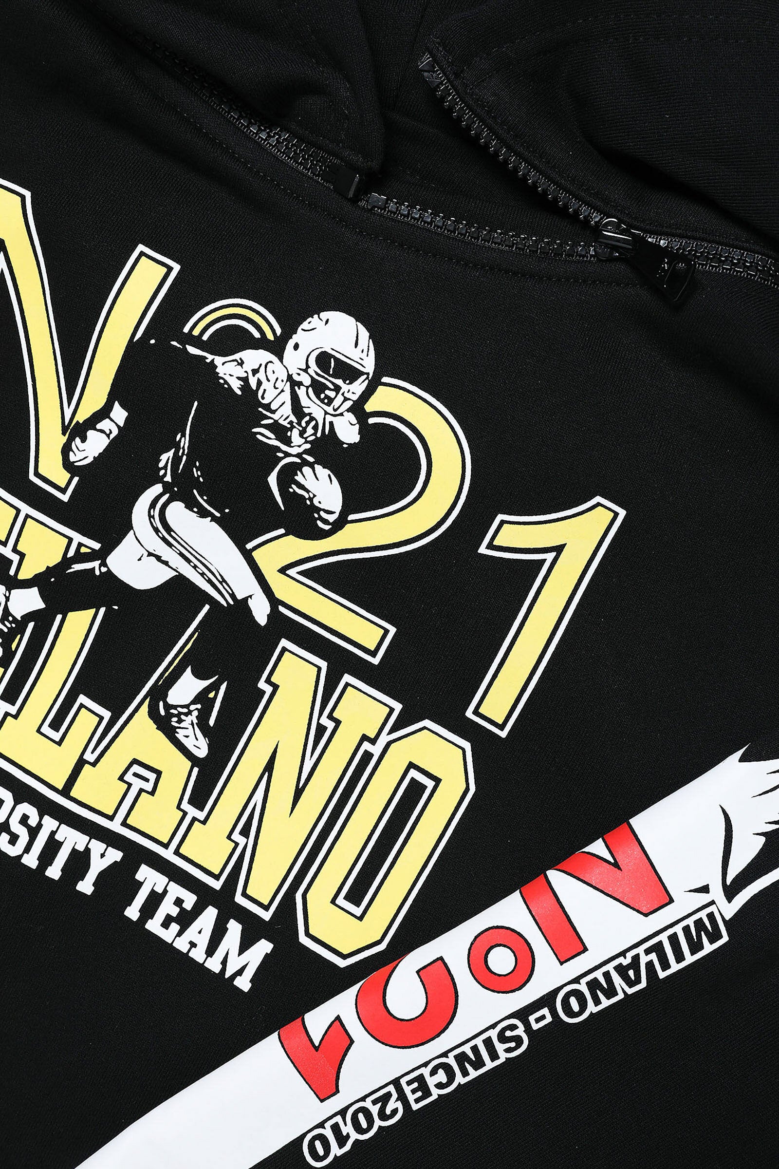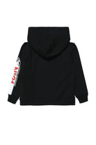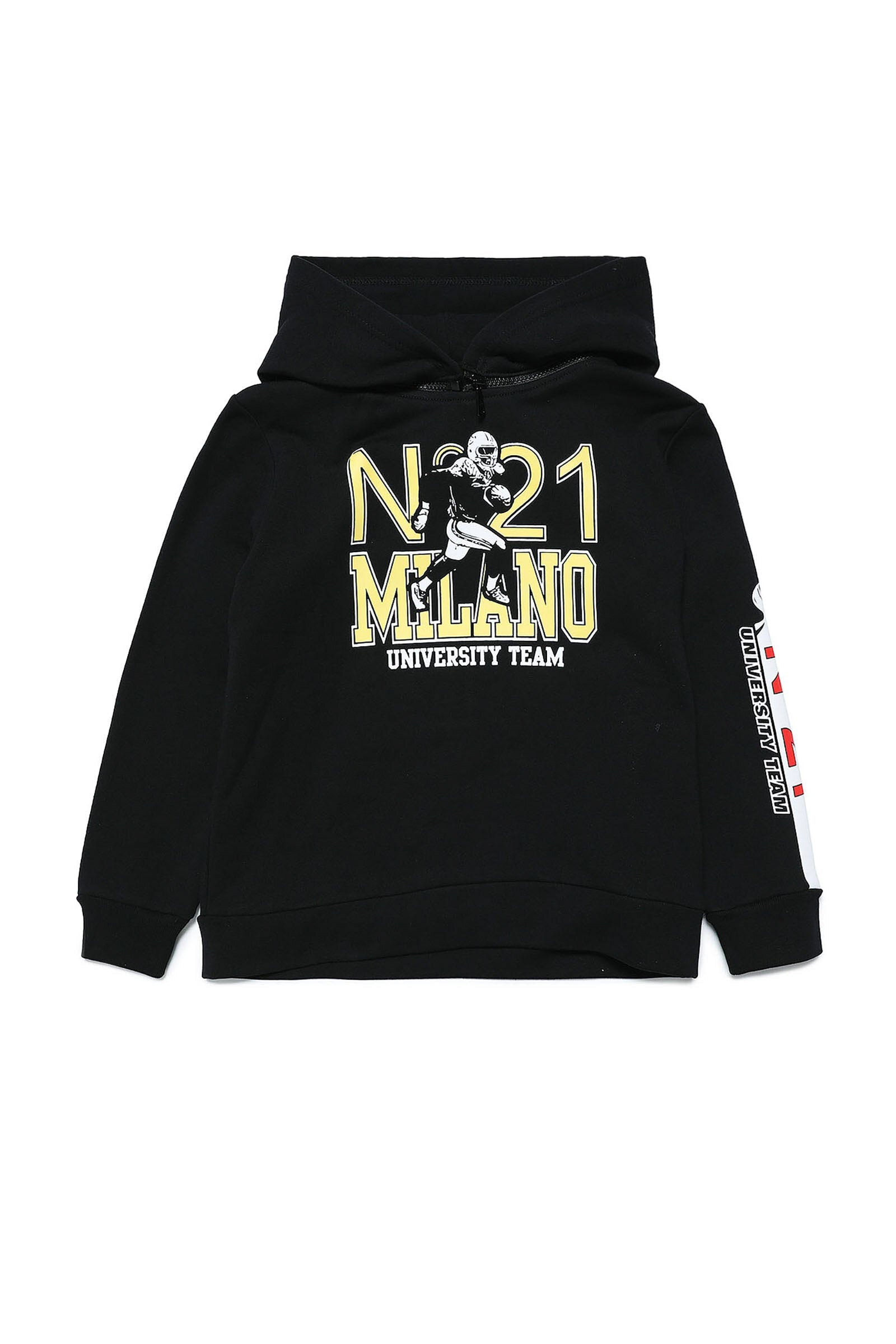 Black cotton sweatshirt with detachable hood with zip, college-style print on the front and sleeve, and ribbed cuffs and hem.